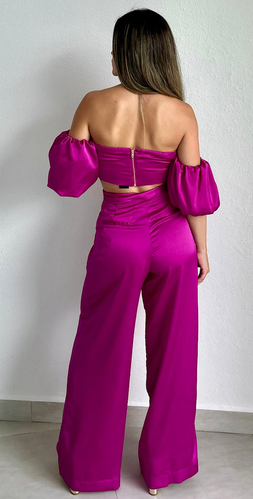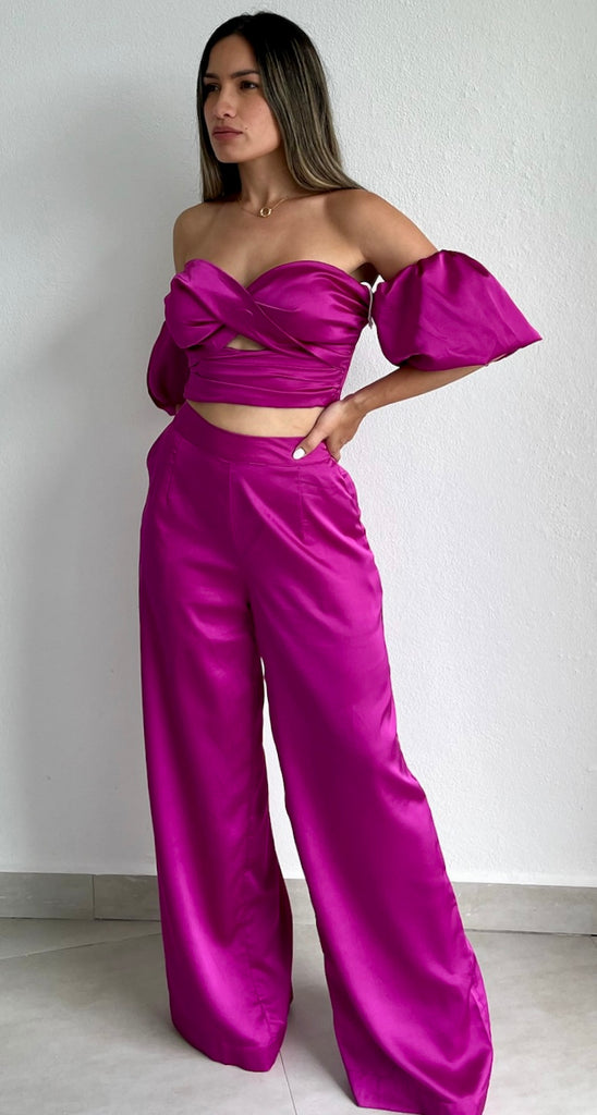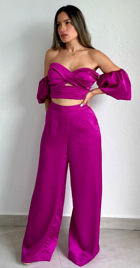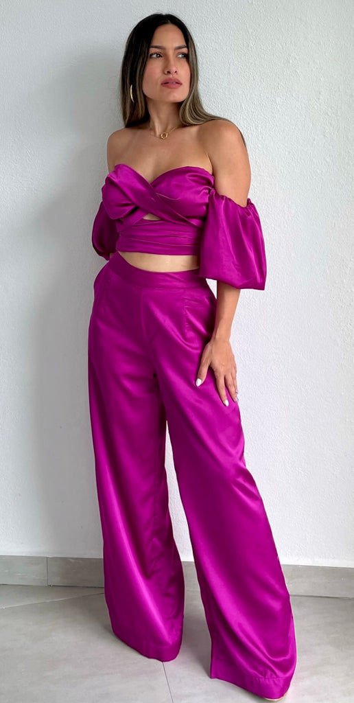 featuring Crossed Off-The-Shoulder Top with Puffy Short Sleeves and High Waist Satin Palazzo Pants