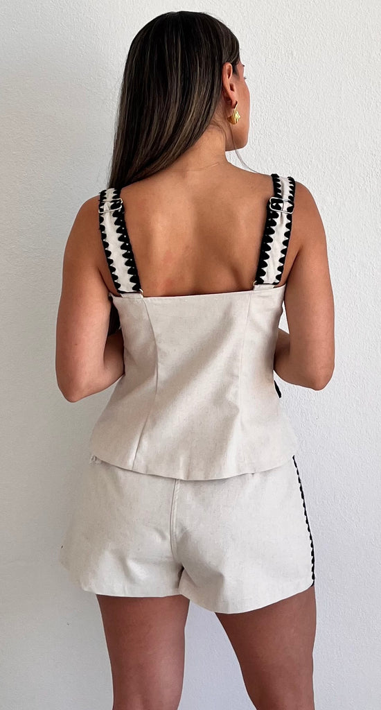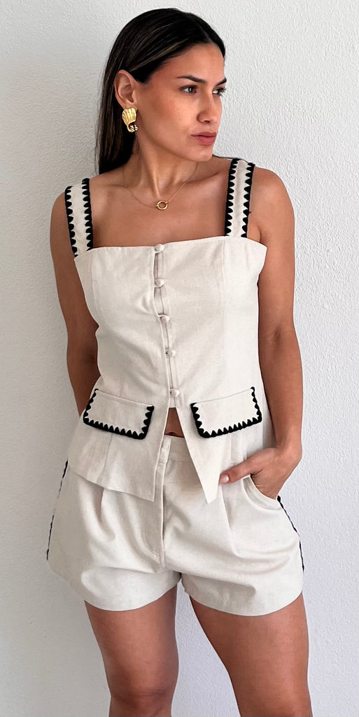 featuring Square Vest Top with Bold Straps with Black Trim Details and High Waist Shorts in a Beige Linen Fabric.