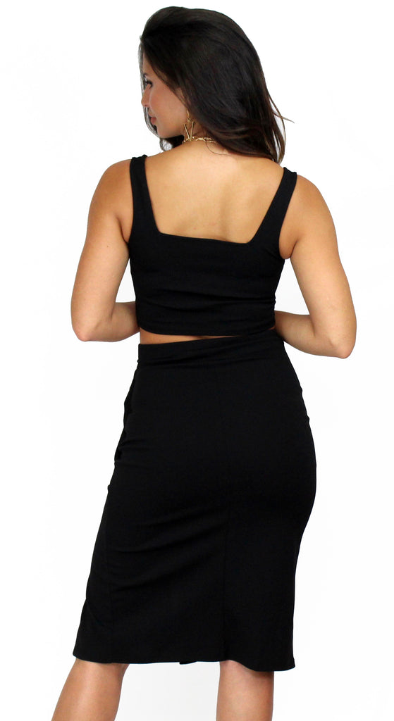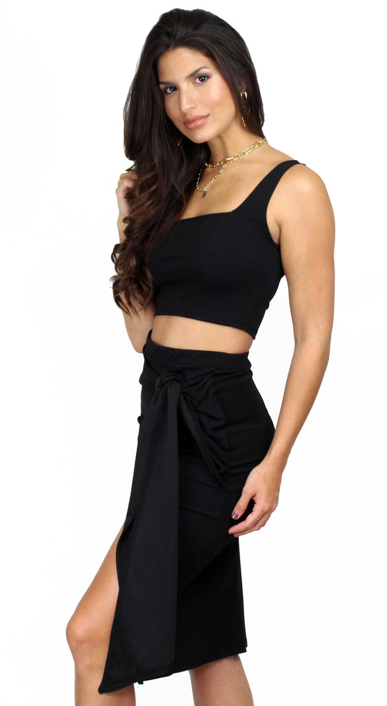 featuring Basic Sleeveless Crop Top with High Waist Pencil Skirt with Slit and Knot Detail at the Waist in a Spandex Black Fabric.