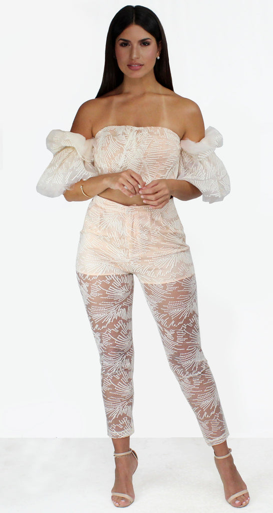 featuring Strapless Crop Top with Puff Short Sleeves and High Waist Skinny Pants in See Thru White Brocade Fabric.
