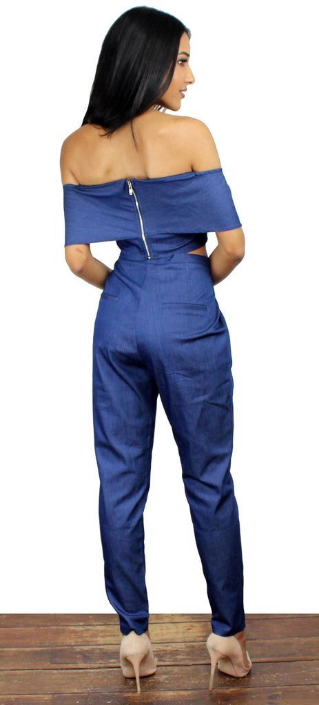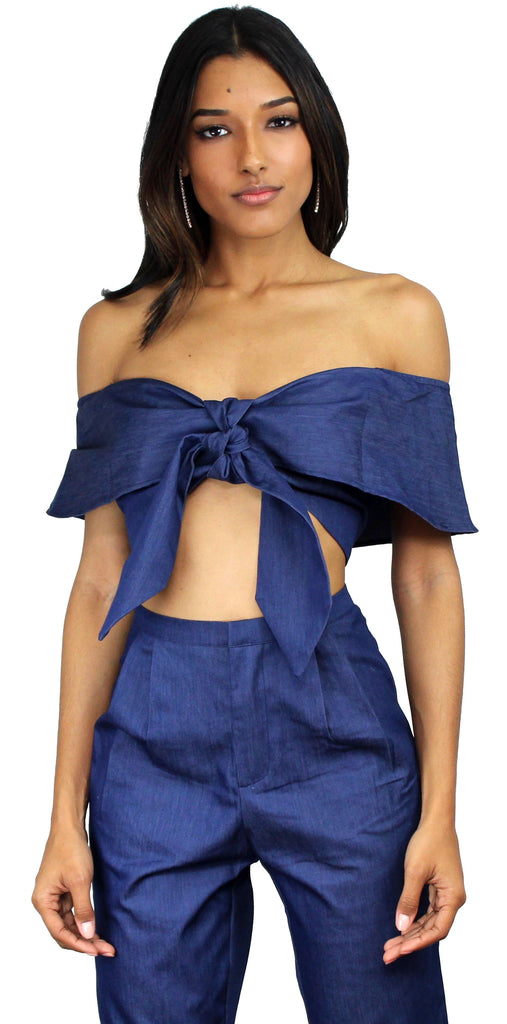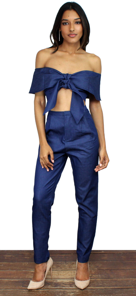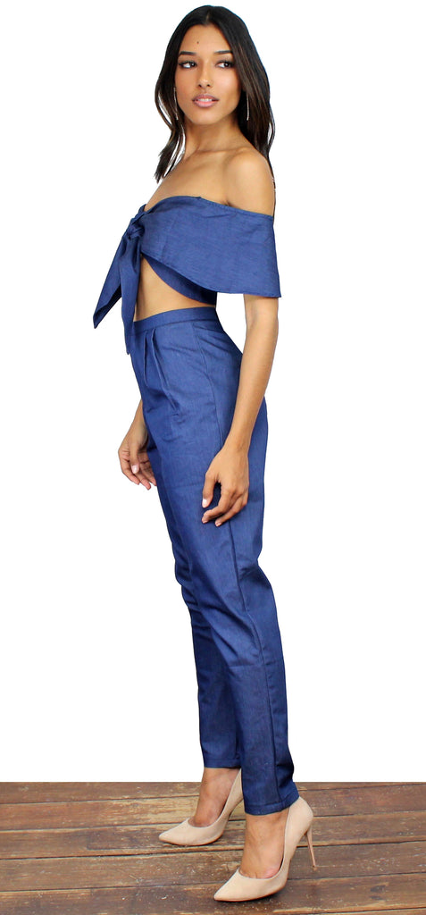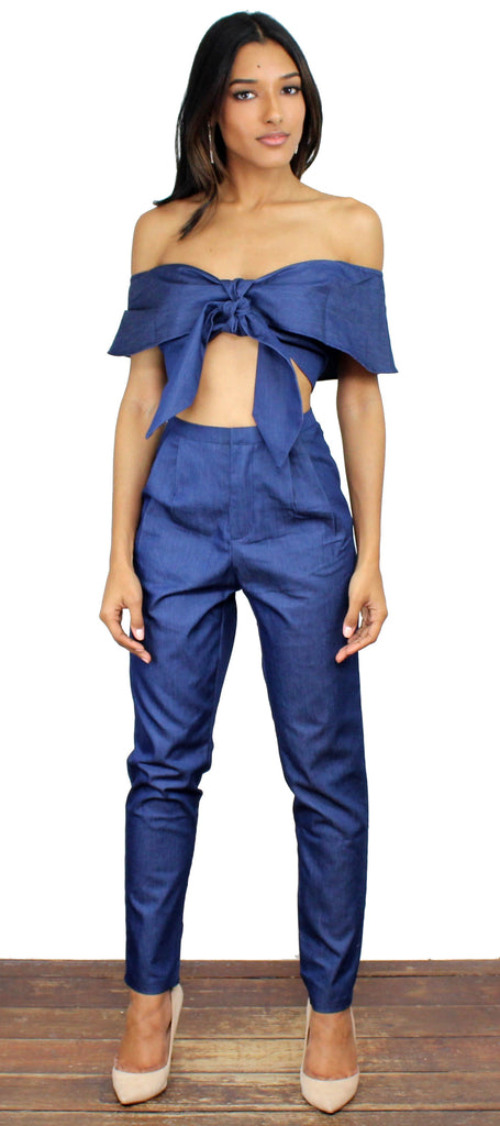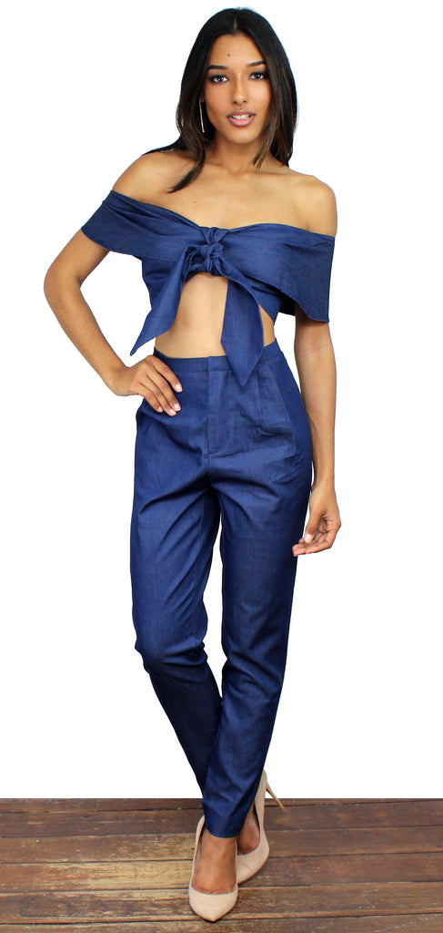 featuring Off-The-Shoulder Ruffle with Knot at the Center of the Crop Top and High Waist Skinny Pants in a Light Denim Fabric