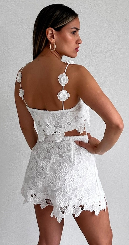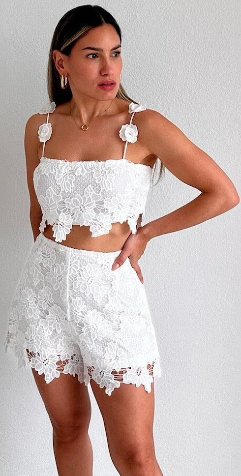 featuring Tube Crop Top with Spaghetti Straps & Flowers Detail and High Waist Shorts in a White Delicate Crochet Fabric.