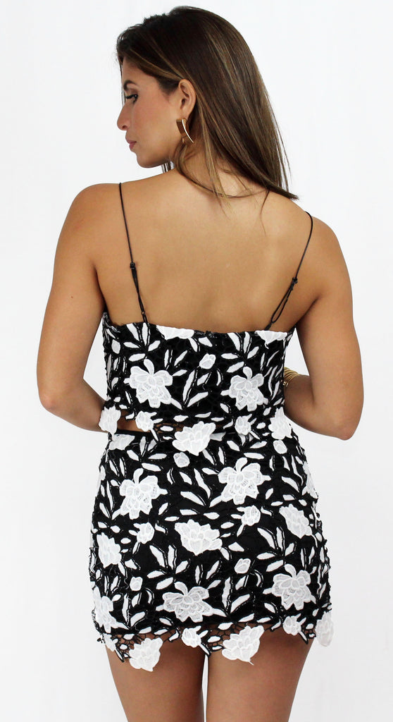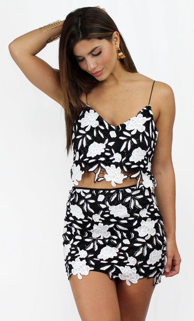 featuring Flare Crop Top & Mini Skirt in a Black & White Floral Crochet Fabric.