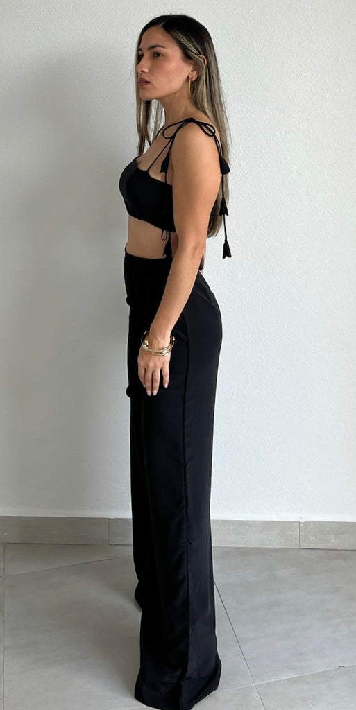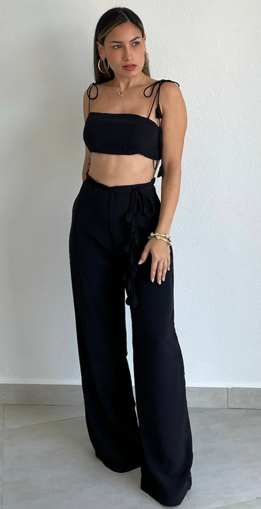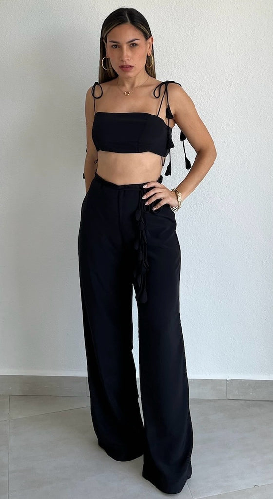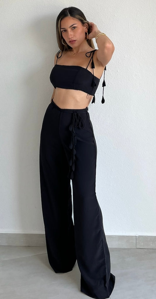 featuring Tube Crop Top with Adjustable Tassels Spaghetti Straps at the arms and High Waist Palazzo Pants with Tassels Spaghetti Straps Adjustable the Waist in a Black Fabric.