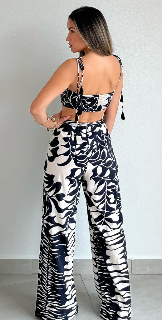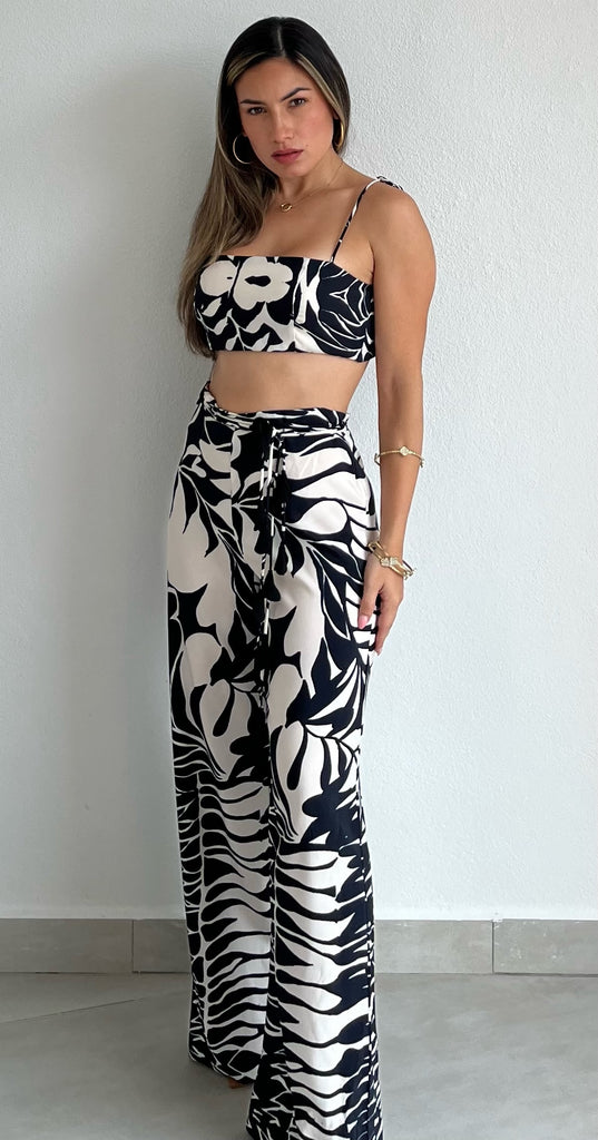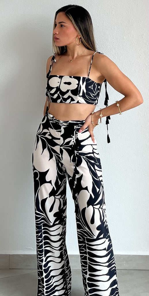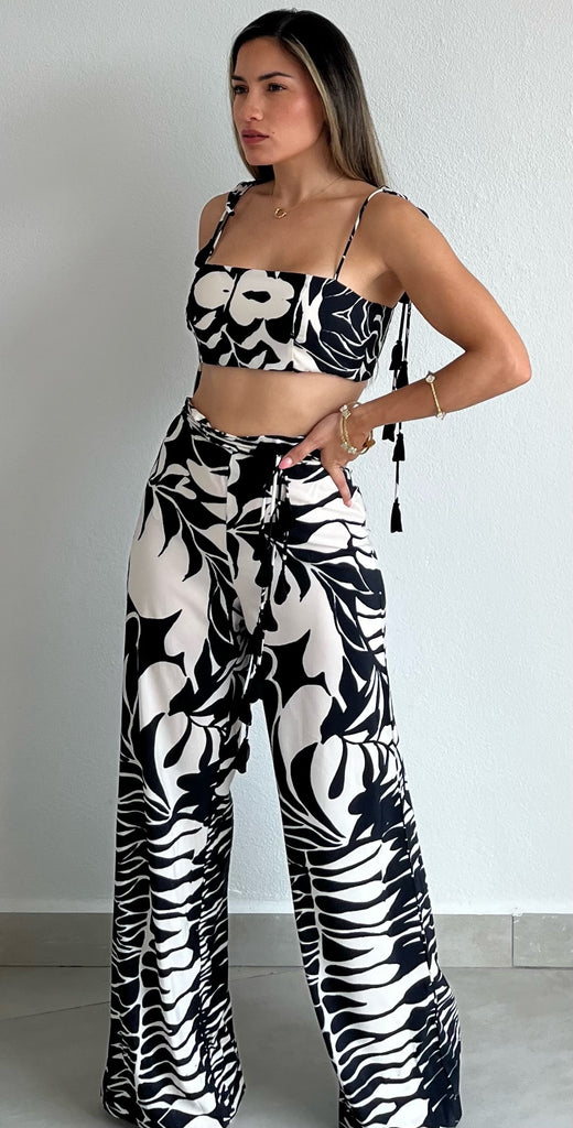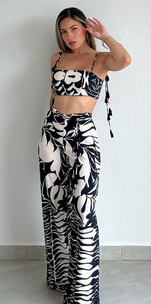 featuring Tube Crop Top with Adjustable Tassels Spaghetti Straps at the arms and High Waist Palazzo Pants with Tassels Spaghetti Straps Adjustable the Waist in a Print Fabric.