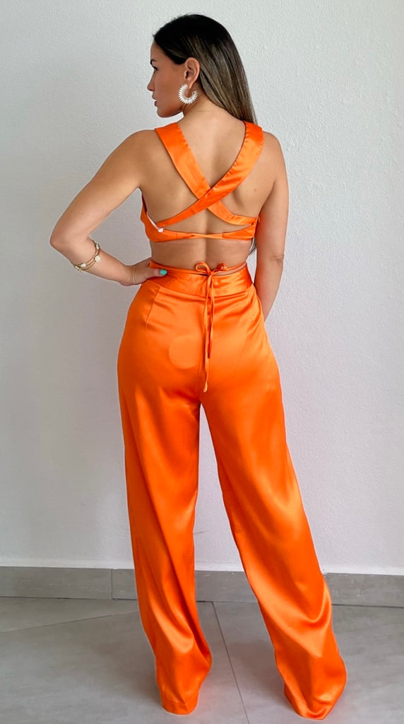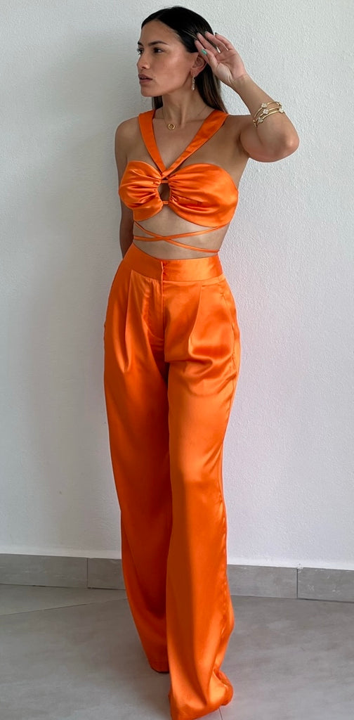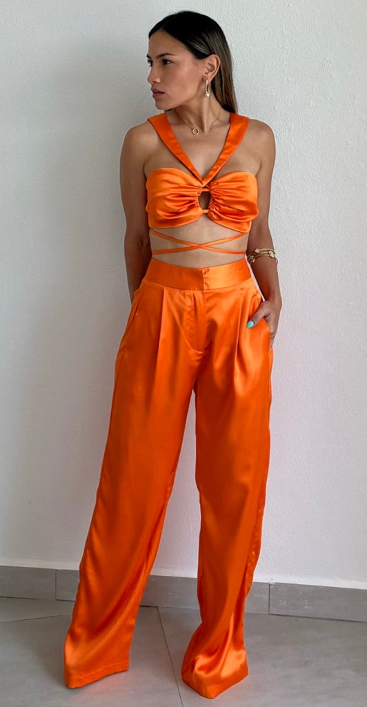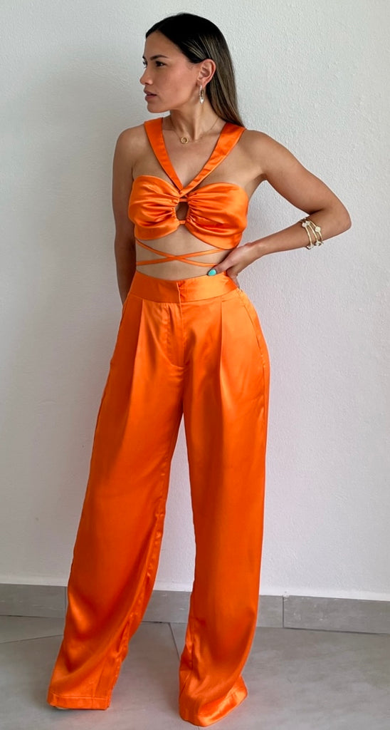 featuring Crossed at the Back Crop Top with High Waist with Pockets Palazzo Pants in a Orange Soft Satin Fabric.