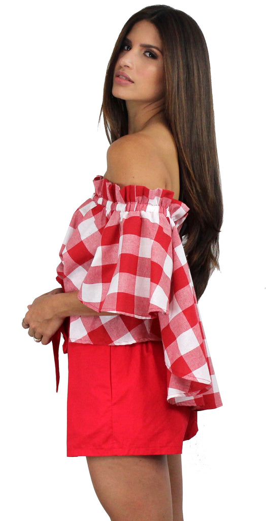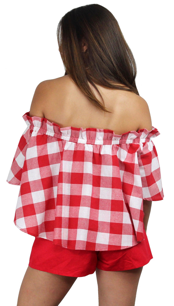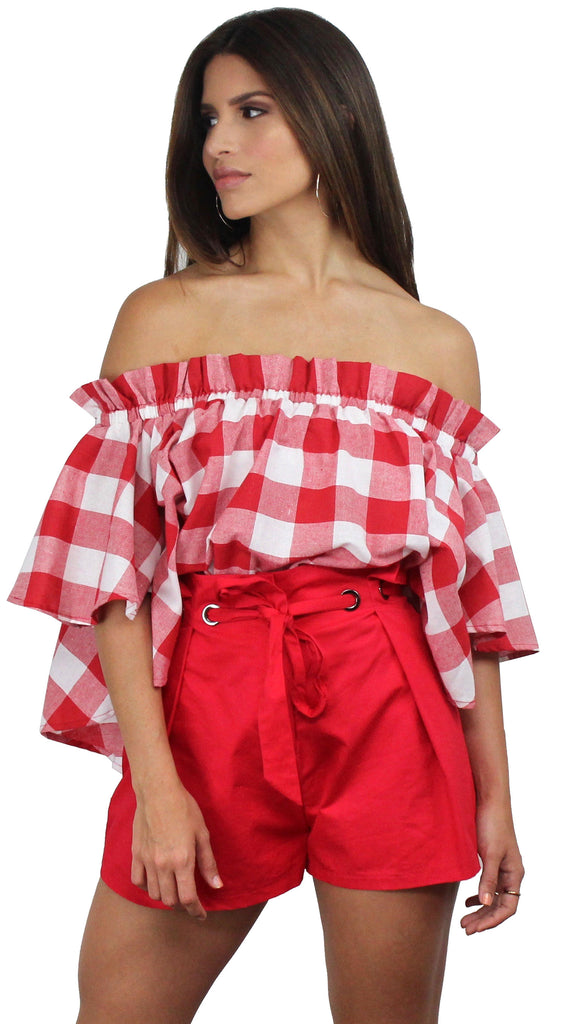 featuring Off-Shoulder Flare Red and White Gingham Top with Short Sleeves & Red High Waist Shorts with Pockets.