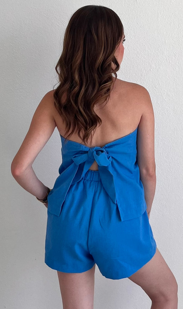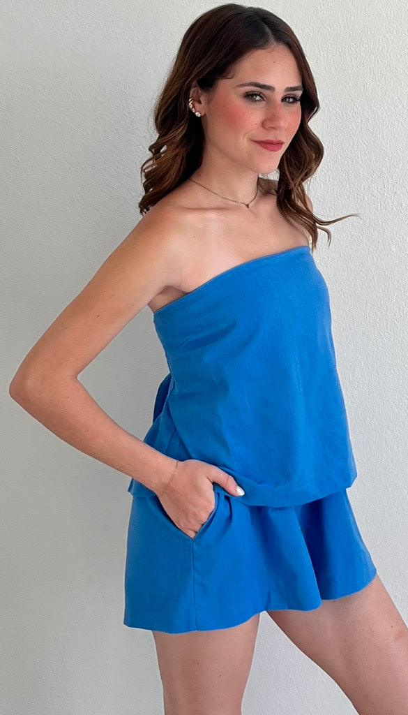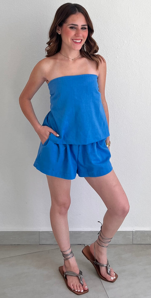 featuring Strapless Long Top, Adjustable with Bow at the Back and High Waist Flare Shorts with Pockets in a Linen Fabric.