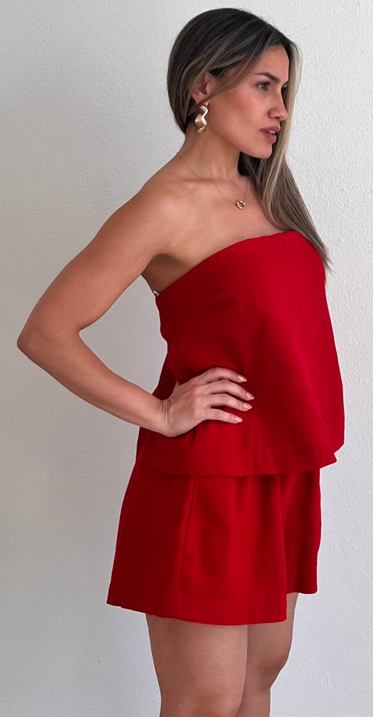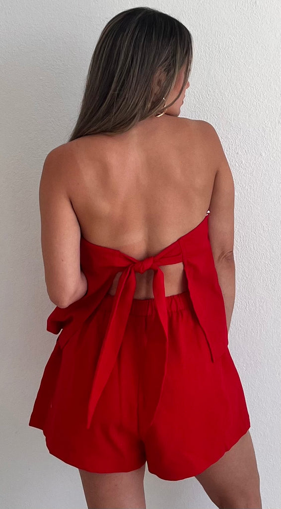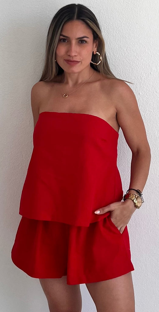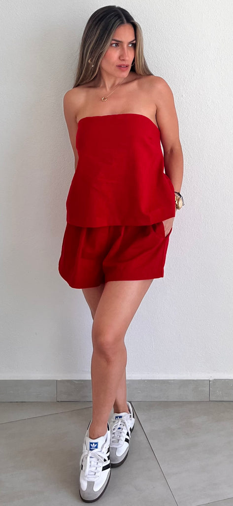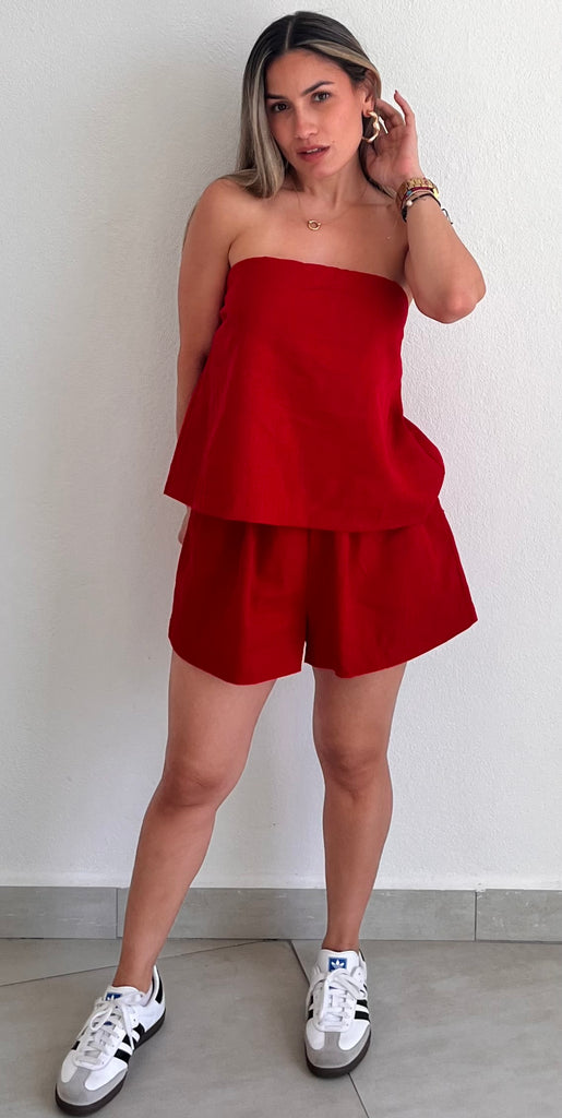 featuring Strapless Long Top, Adjustable with Bow at the Back and High Waist Flare Shorts with Pockets in a Linen Fabric.