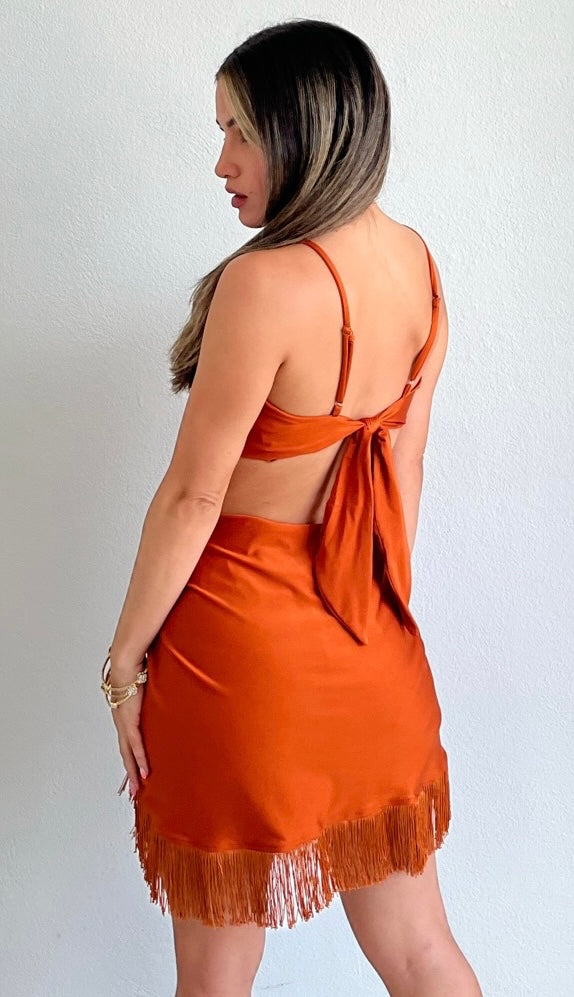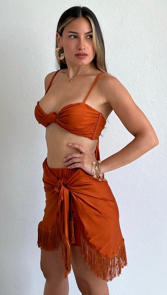 featuring Knot Crop Top with High Waist Skort with Fringes Detail.