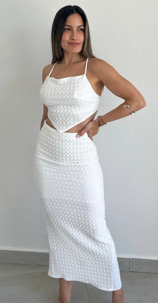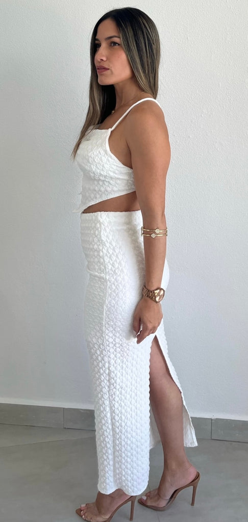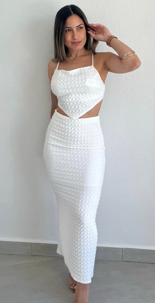featuring Cowl Neck Crop Top with Crossed Back with High Waist Maxi Skirt with Open Slit at the Back in a Texture Light Spandex White Fabric.