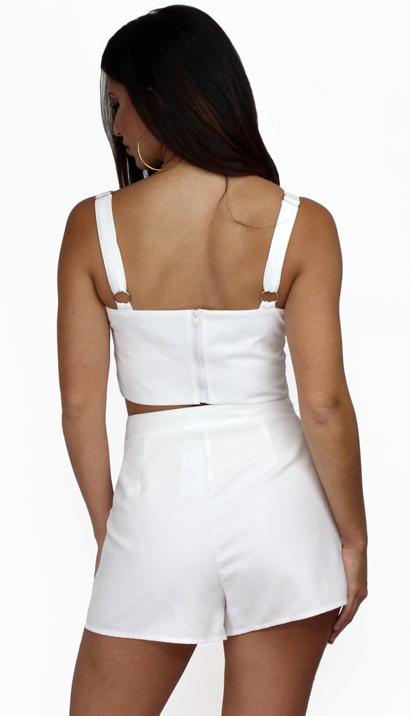 featuring V-Neck Crop Top with Bold Straps & White Waist Shorts with Pockets in a White Soft Fabric.