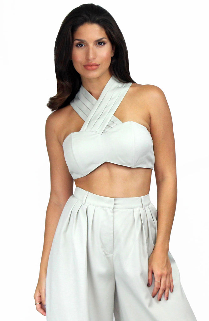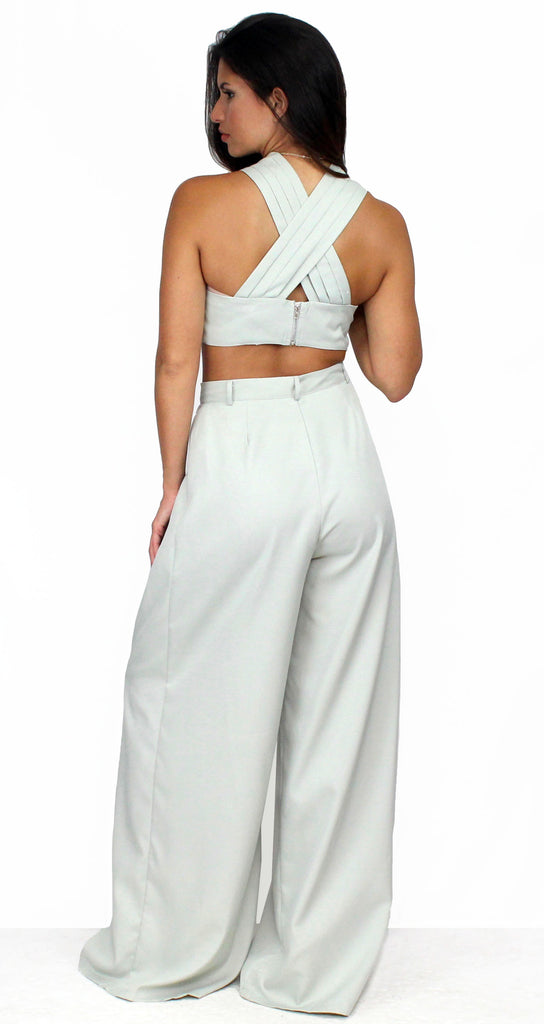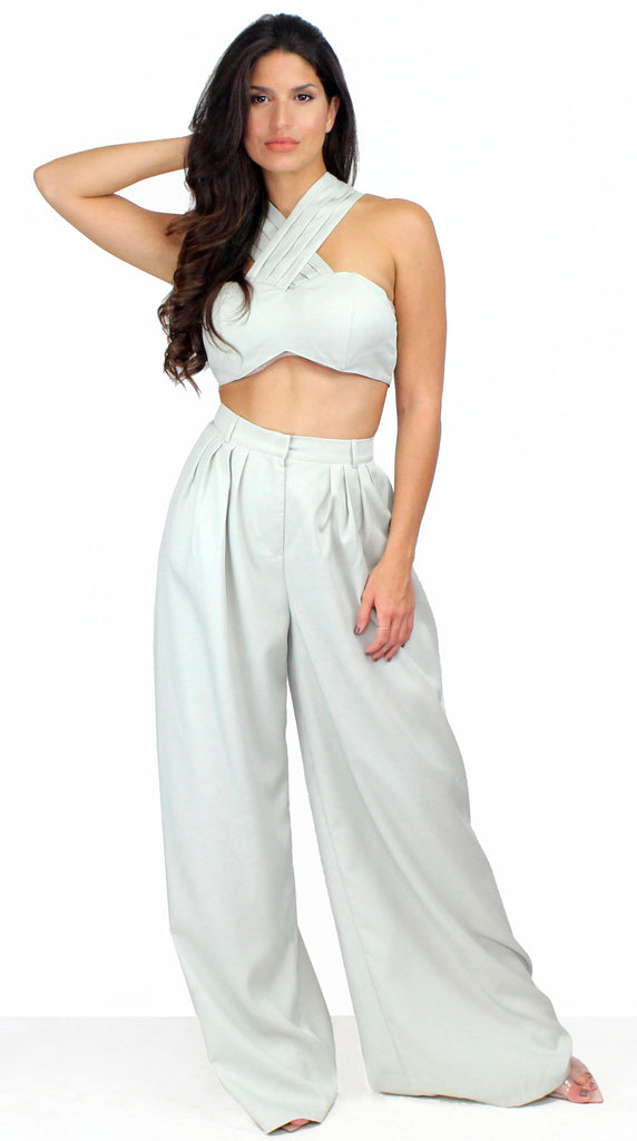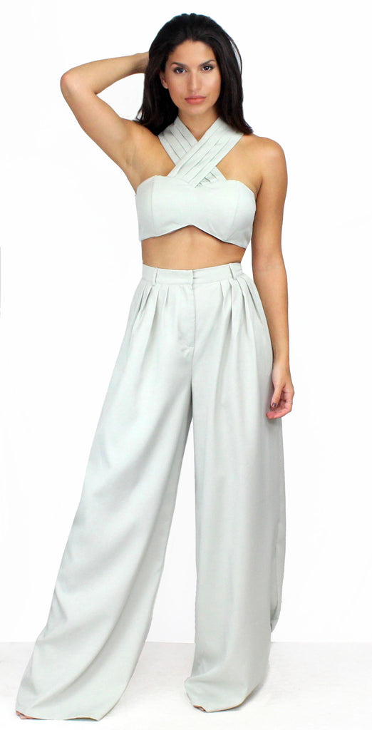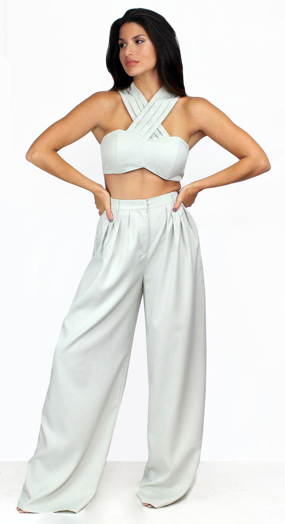 featuring Crossed Halter Crop Top with High Waist Palazzo Pants in a Soft Sage Fabric.