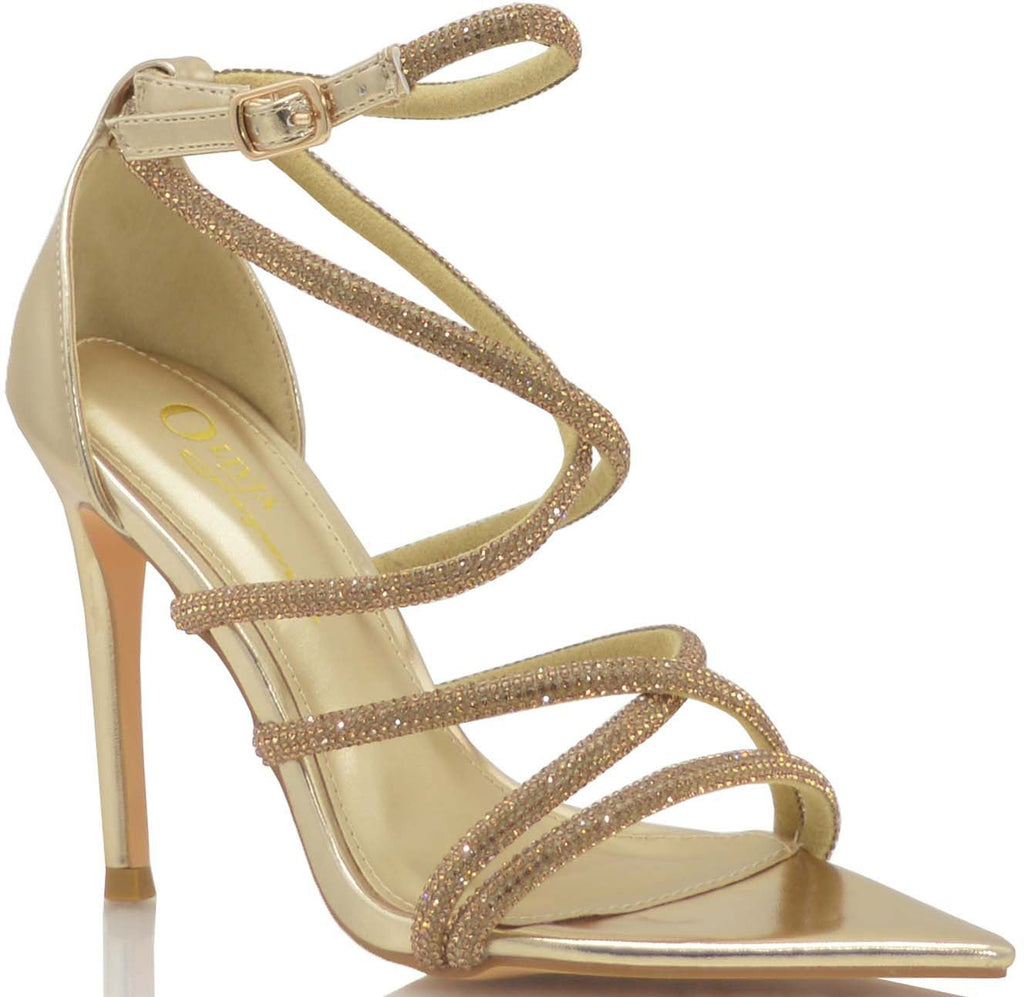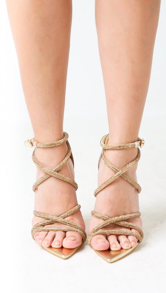 Step out on the scene looking glamorous with the Golden Glam Rhinestones Strappy Heels. Pointed-Toe High Heels Sandals with Crossed Rhinestones Straps. Crafted with quality materials, these luxurious heels provide sophistication.