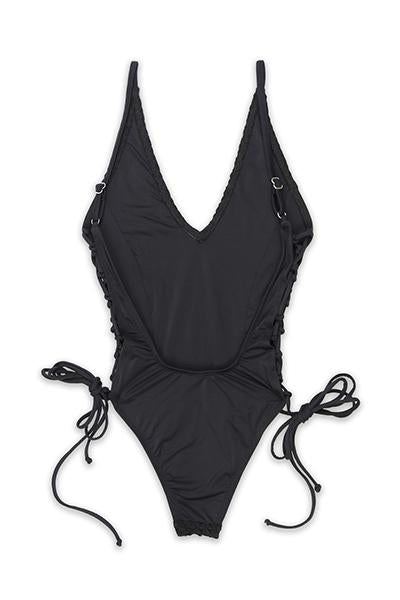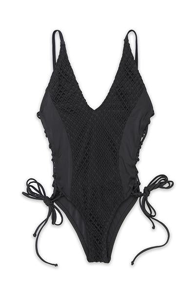 Turn heads with the Expedition one-piece. Tie-up sides with a low dipping back and a fishnet overlay expose a touch of your naughty nature.