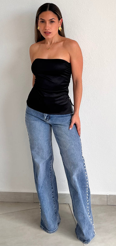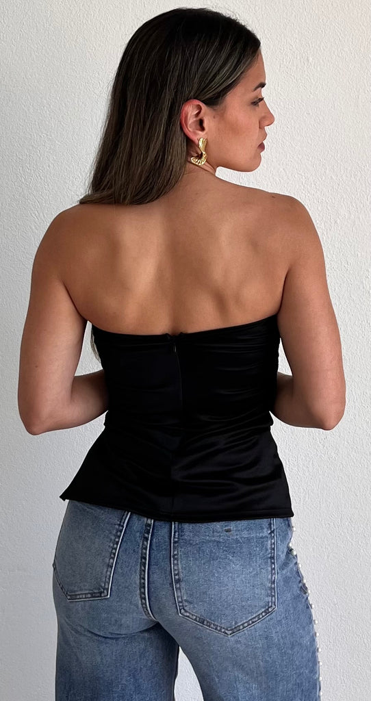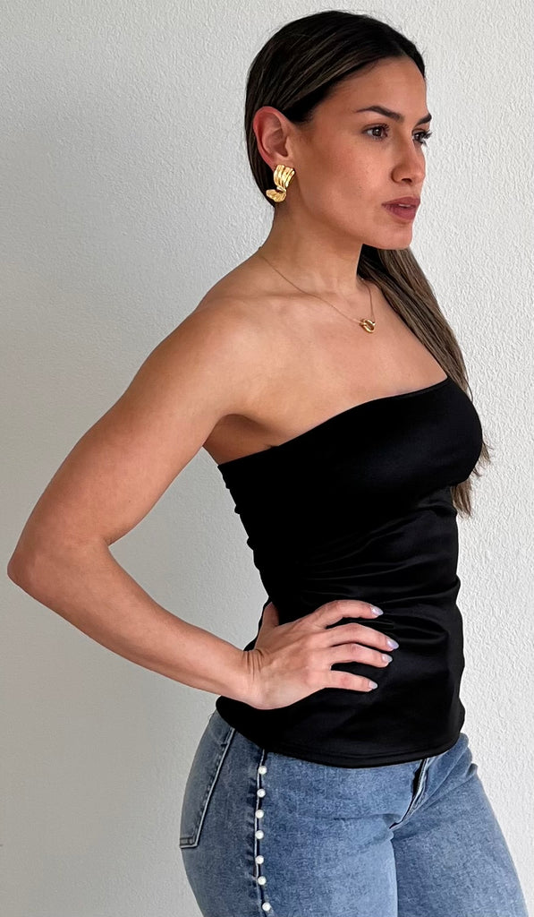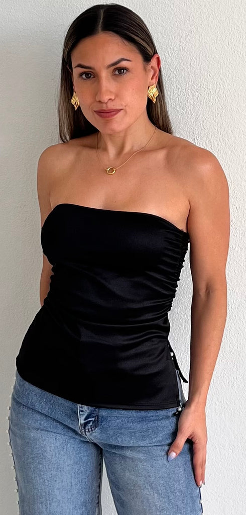 featuring Strapless Top, Draped at the Side and Fitted at Waist in a Satin Spandex Fabric.