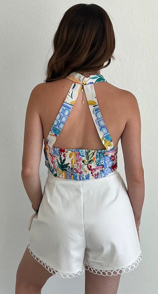 featuring Halter Flare Crop Top with Crossed Bold Straps at the Back in a Print Fabric.