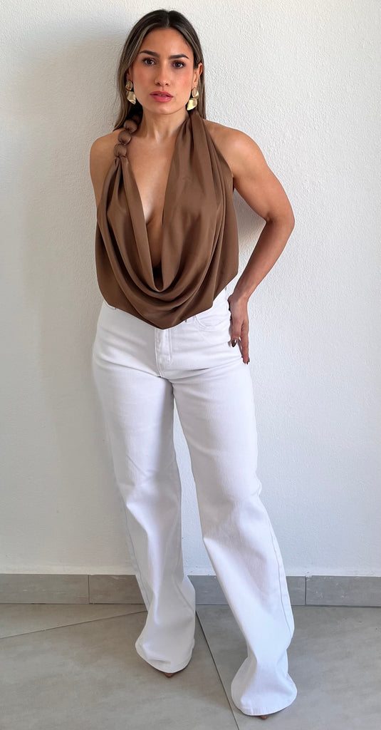 featuring Halter-Cowl Neck with On-Side Balls Necklace Detail, Adjustable at the Waist and Asymmetrical Top in a Mocha Fabric.