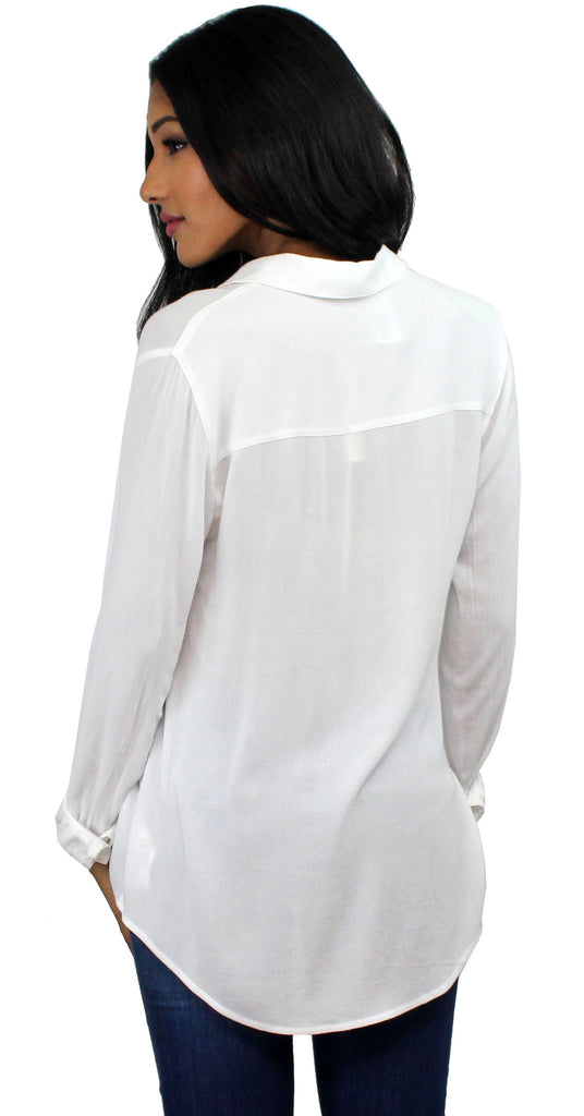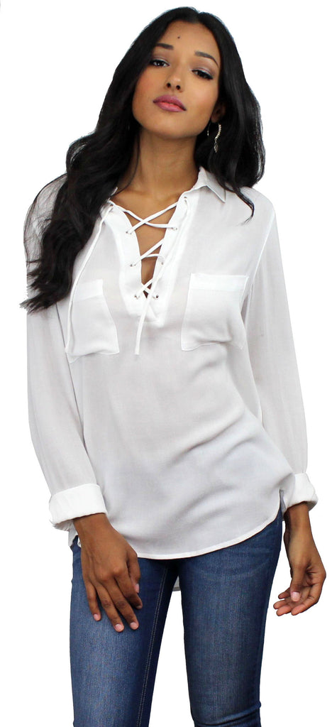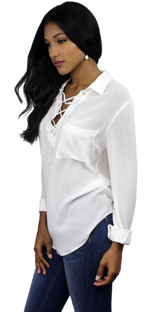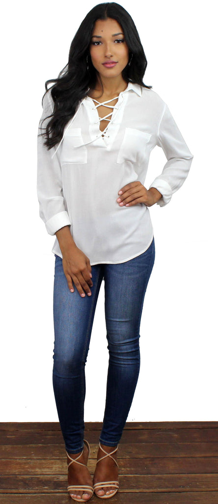 featuring Lace-Up with Pockets at the Bust & Long Sleeve White Top