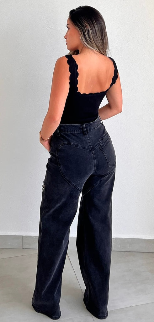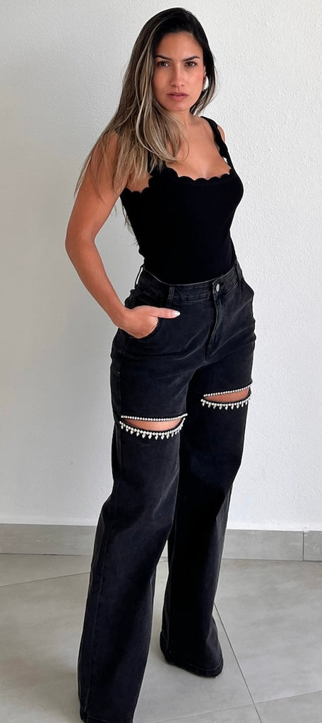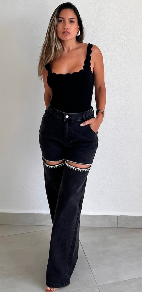 featuring High Waist Wide-Leg Black Wash Denim with Rhinestones & Cut-Out Detail.