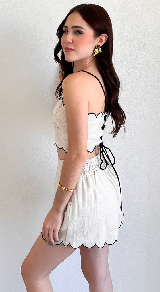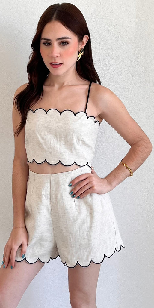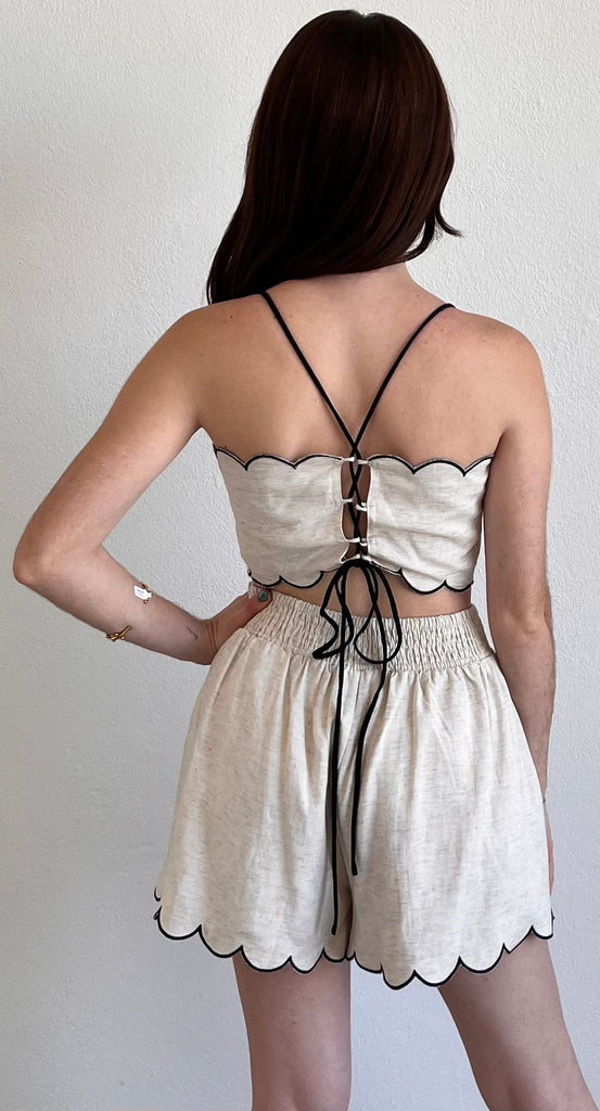 featuring Square Crop Top with Spaghetti Straps and Crossed Back with High Waist Shorts in a. Beige Cotton Fabric.