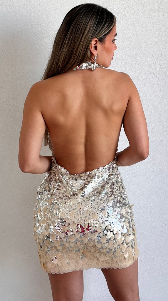 featuring Halter Top with Cowl Neck and Fitted Mini Skirt in a Silver Ombré to Nude Sequins Spandex Fabric.