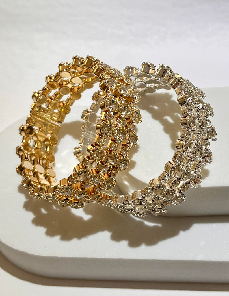 Shiny gold ir silver-toned metal shape this luxurious bracelet that casually boasts a cuff-style design composed of gleaming outlined by sparkling rhinestones.