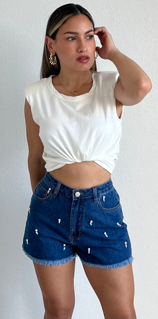 featuring High Waist Denim Shorts with Pearls Detail at the Front.