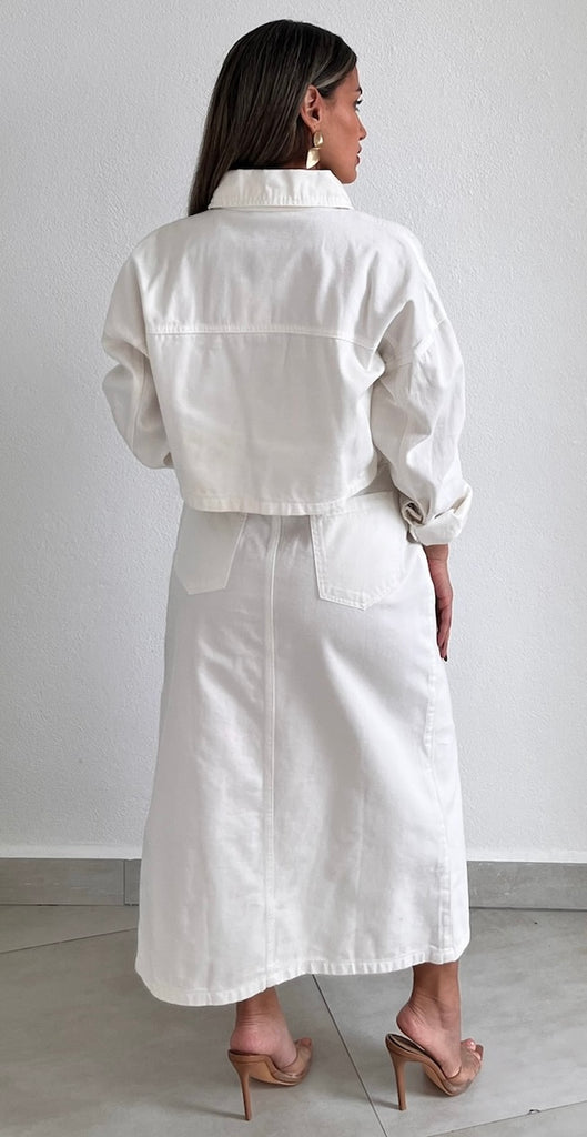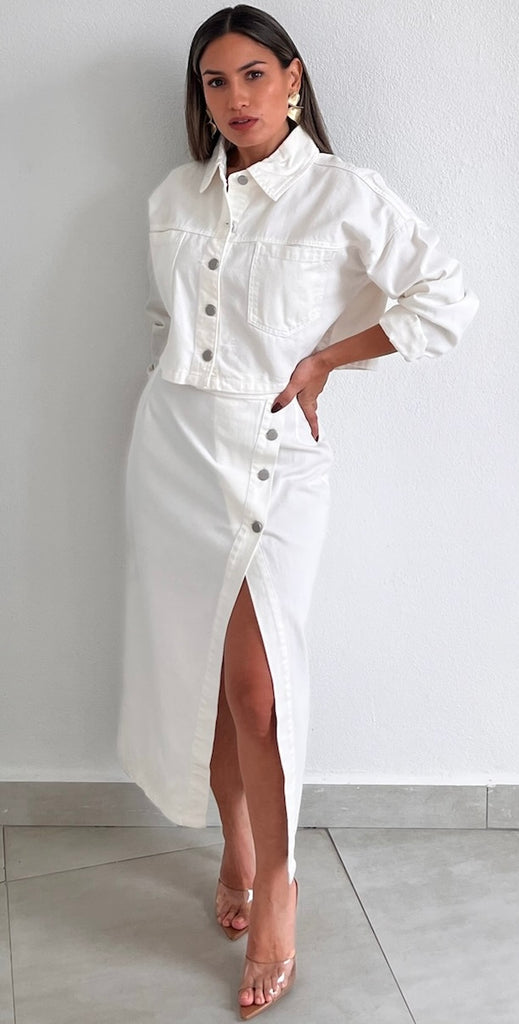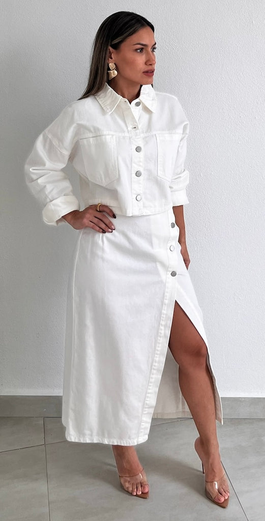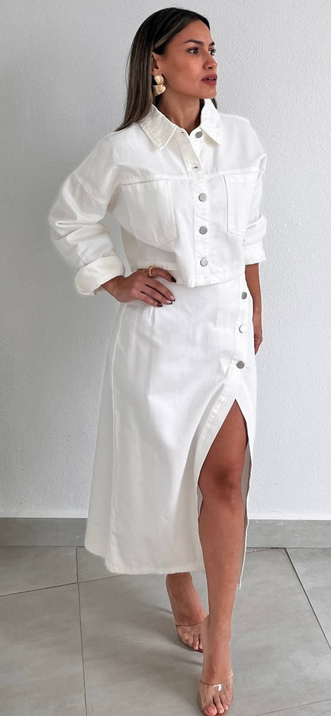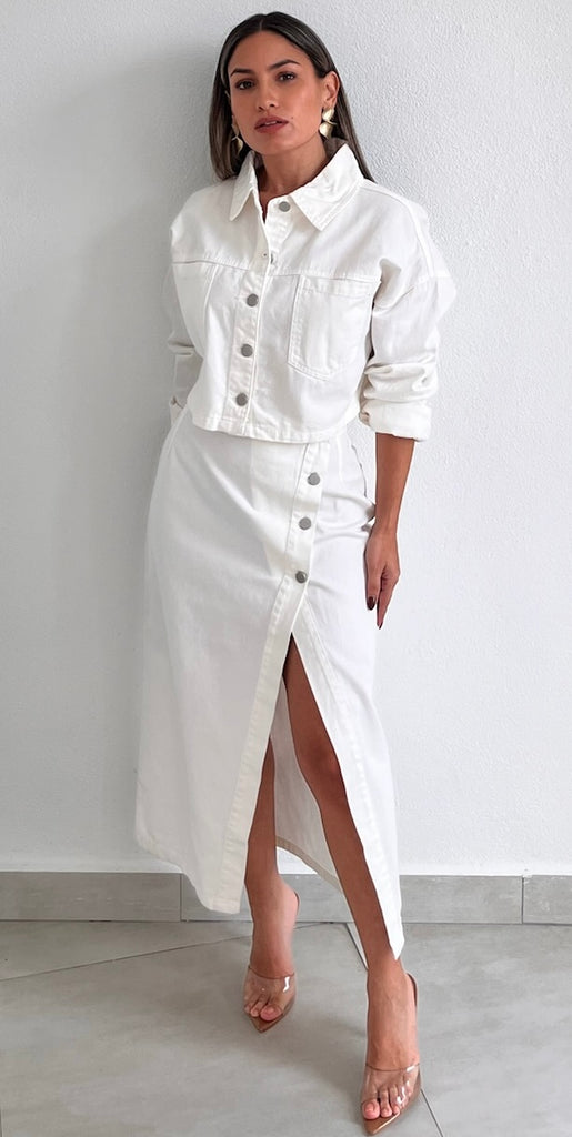 featuring Long Sleeves Jacket with Silver Buttons and Pockets at the Front with High Waist Midi Skirt with Open Slit and Silver Buttons at Front in a White Denim Fabric.