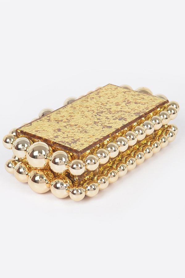 The Exclusive Style Gold Glitter Acrylic Box Clutch has that special something that will make everyone fawn over your 'fit! This acrylic clutch features a mesmerizing glitter design that shapes a hard case silhouette, gold balls beaded top, sides and bottom with top clasp closure. The interior features accordion sides and a removable gold chain strap.
