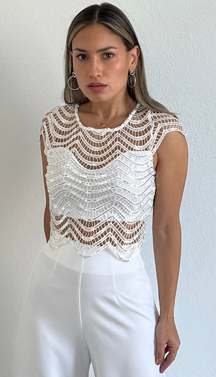featuring Short Sleeves See Through Top with White Crop Lining Inside in a White Crochet & Silver Sequins Fabric.