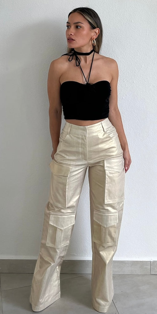 featuring Tube Draped Crop Top with Fabric Flower Detail at the Front and Extra Long Spaghetti Straps to Adjust the at the Neck for Choker Style.