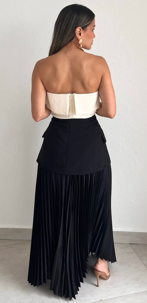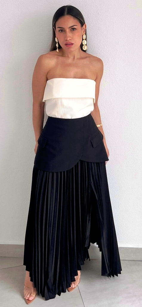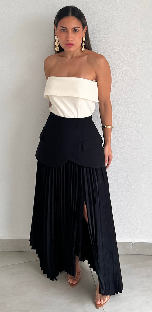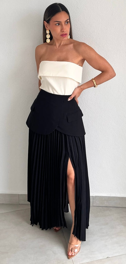 featuring High Waist Over layer Blazer Bottom Detail and Pleated Midi Flare Skirt with Skit in a Black Fabric.