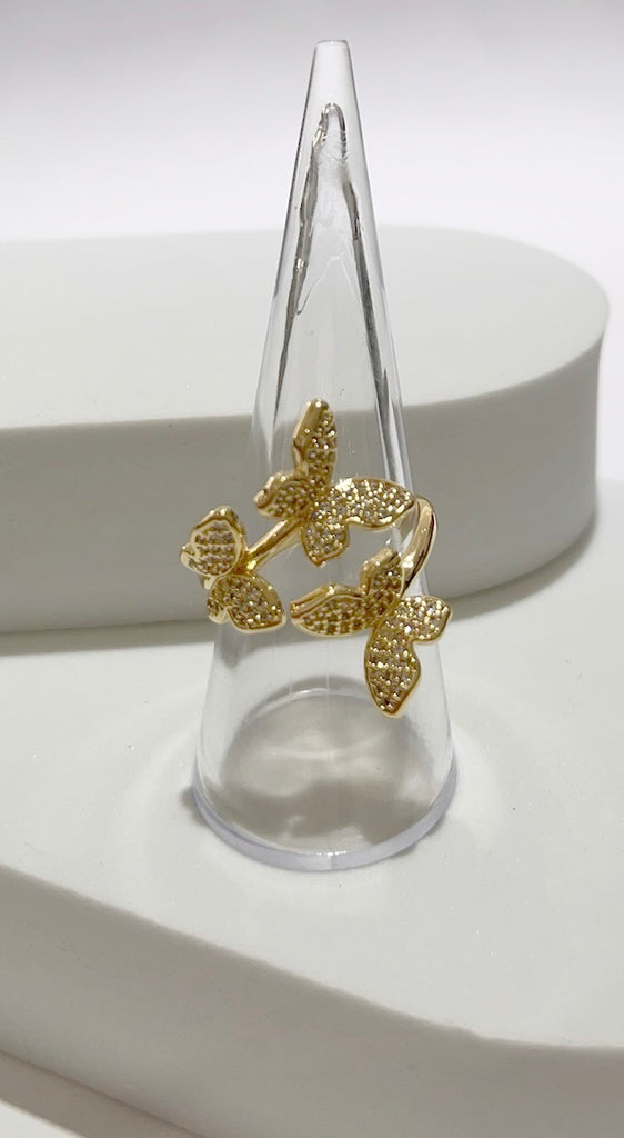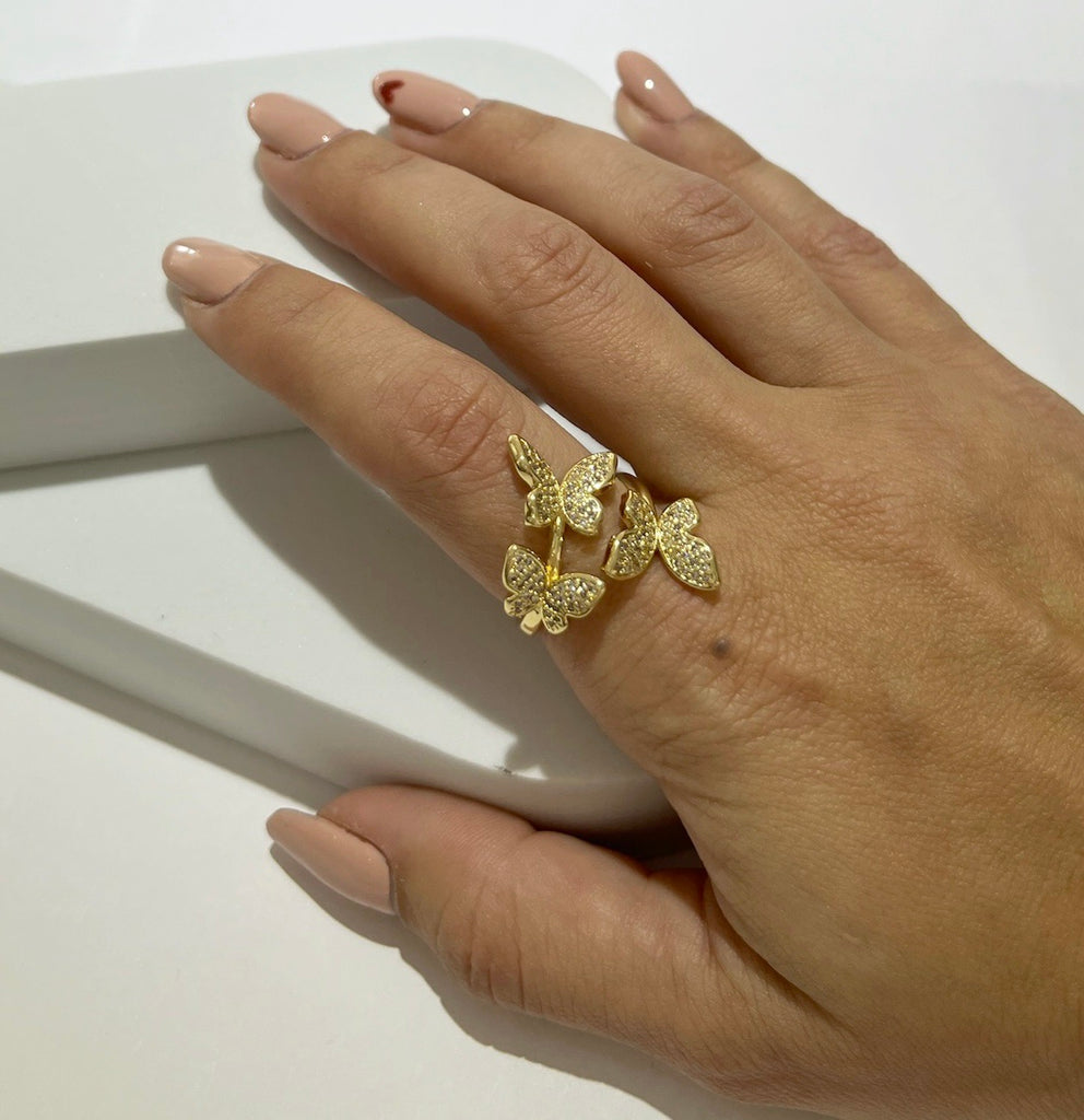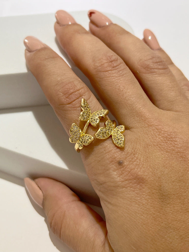 Complete your spring style look with the Glittering Butterfly Gold Ring. Shiny, gold-toned metal shapes this on-trend ring has three butterfly’s in a finger-wrapping design. Tiny rhinestones detail at the butterfly’s adding glam to your outfit.