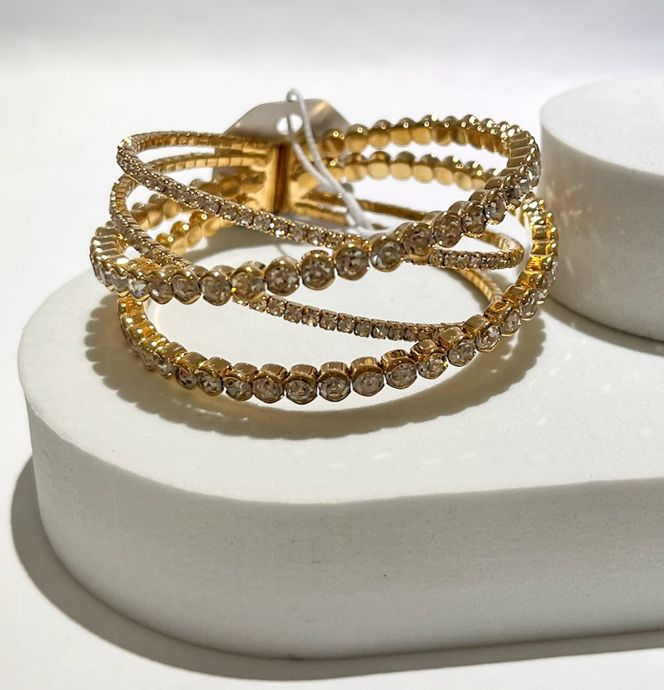 All your most important looks will shine when you add a little glamour, thanks to the Glittering Poise Rhinestones Gold Bracelet! Shiny, gold-toned metal based this elevated, spiral-chic bracelet that has a slender silhouette with inset baguette-cut rhinestones that create this inspired design.