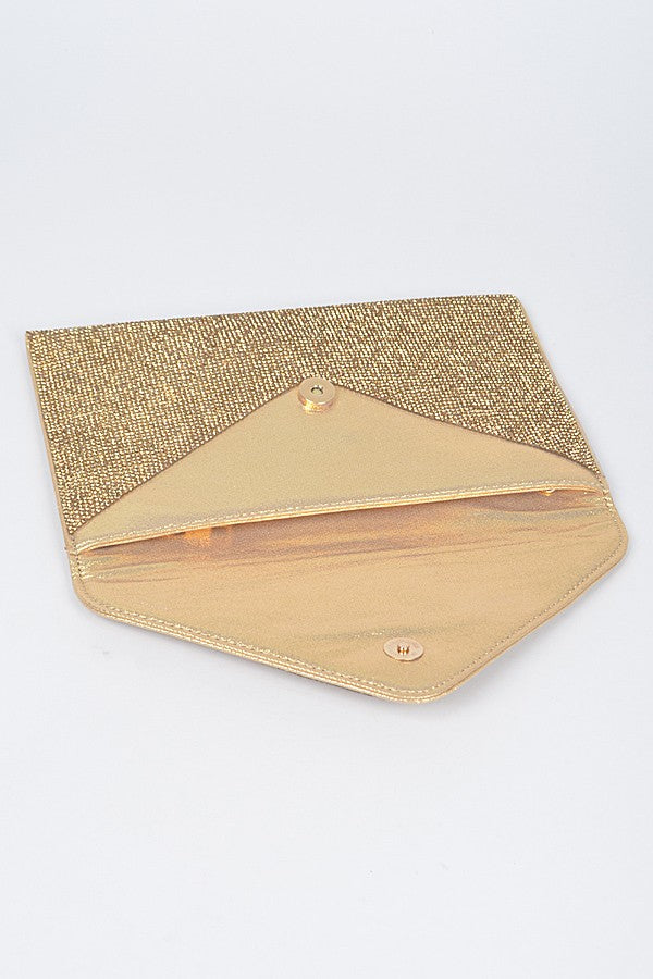Fold-over envelope front with hidden magnetic closure opens up to a lined interior. Detachable gold chain strap converts this clutch into a chic shoulder bag in a snap!