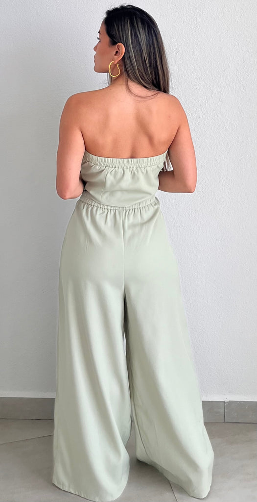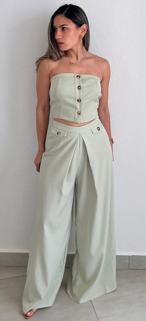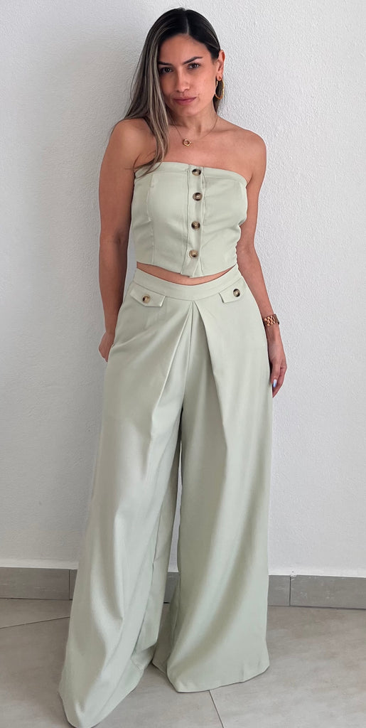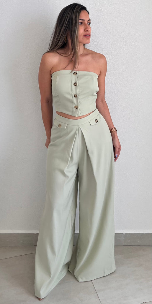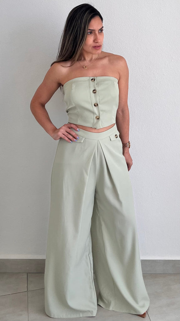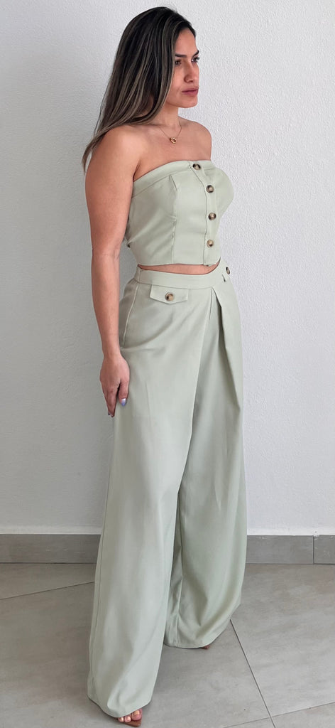 featuring Strapless Vest Top with High Waist Long Trousers Pants in a Soft Sage Fabric.