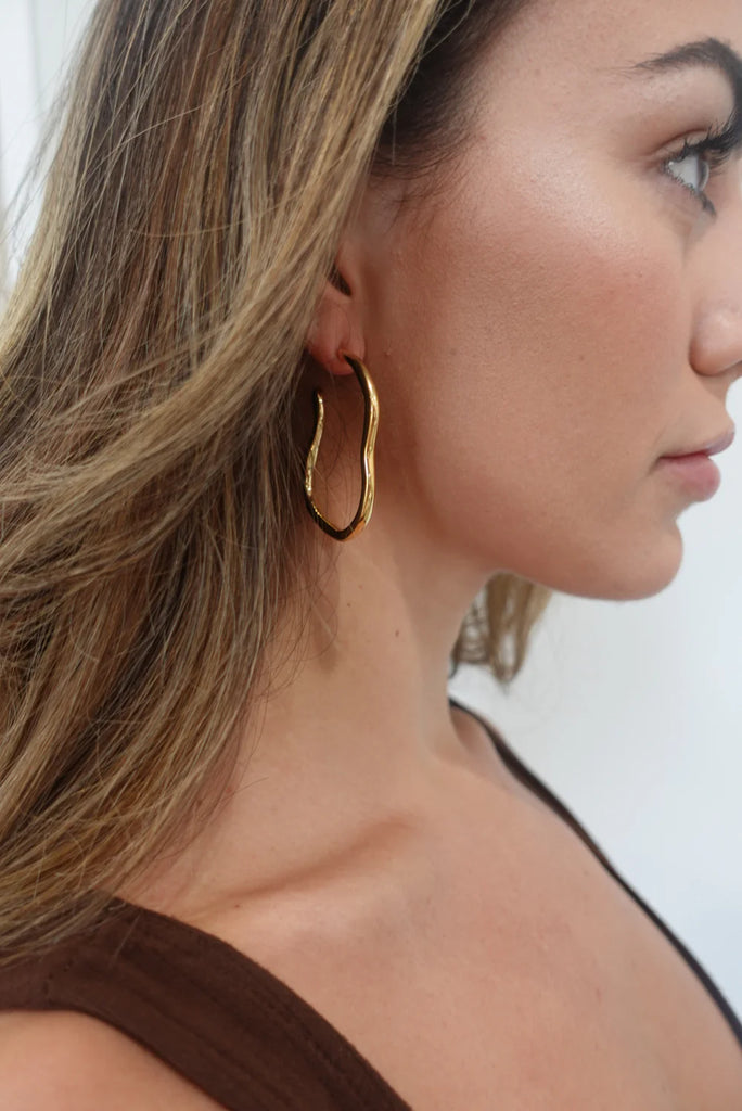 The Orah Hoop is the perfect gold hoop to spice up any outfit! It's unique curved shaped makes it stand out but still have an elegant and edgy appeal.