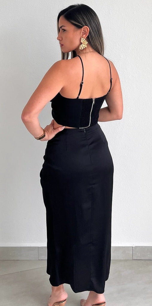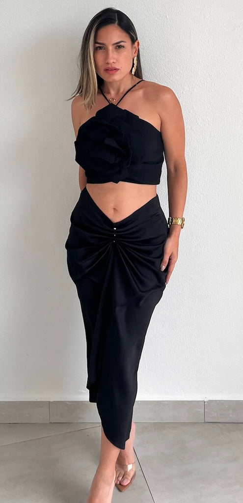 featuring Scrunch Detail at the Front with Metal Gold Detail in a Black Satin Fabric.