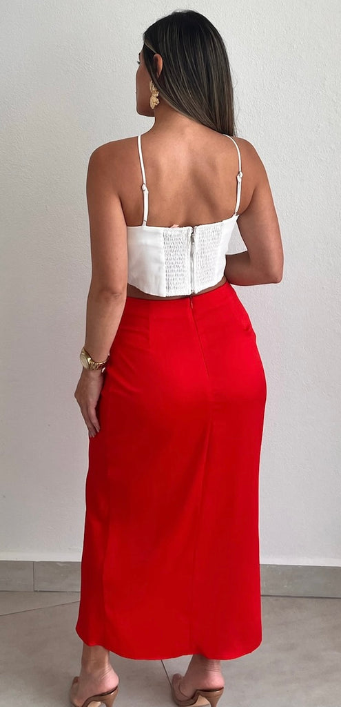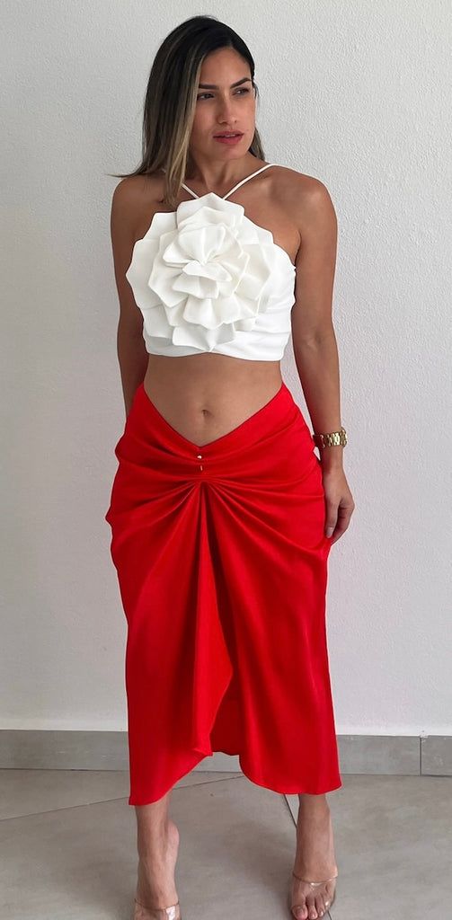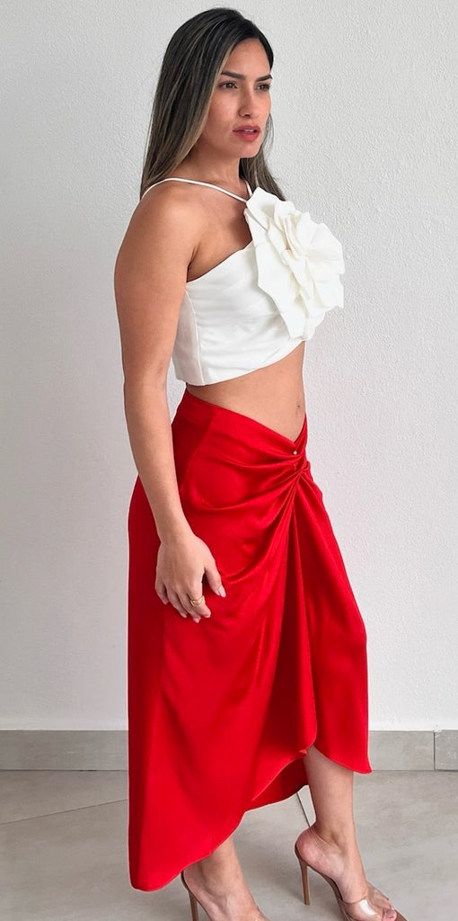 featuring Scrunch Detail at the Front with Metal Gold Detail in a Red Satin Fabric.