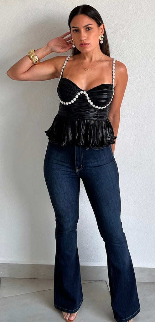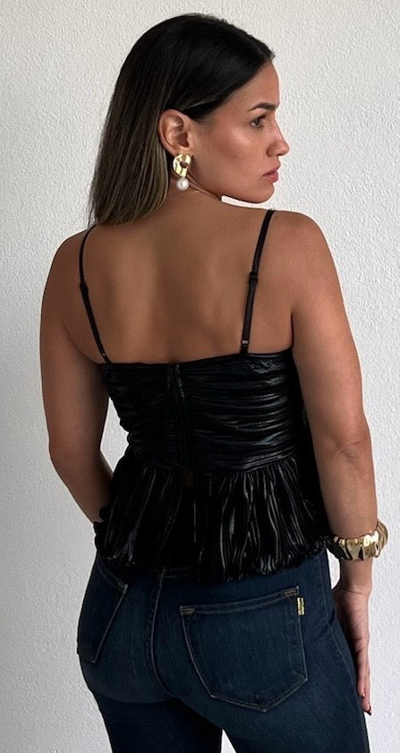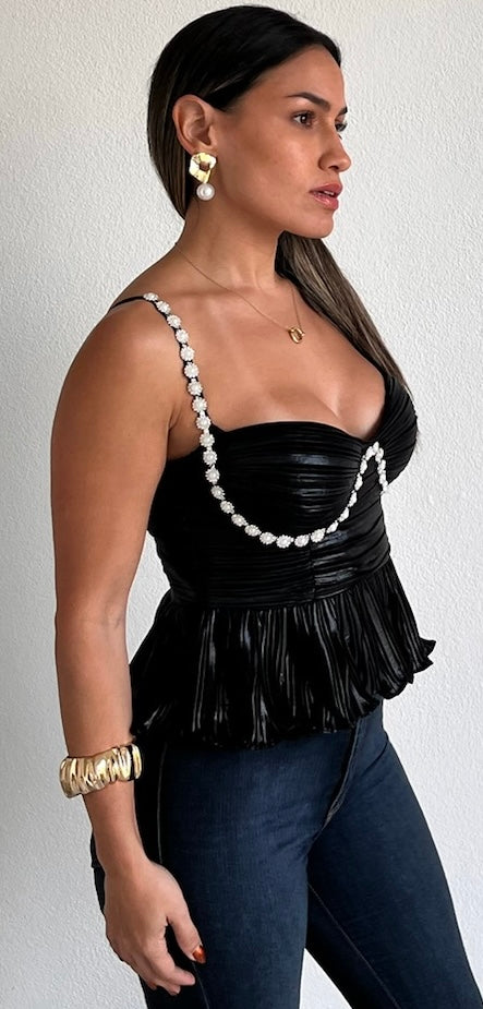 featuring Heart Cut Bust with Pearls Details in a Draped Metallic Black Fabric in a Peplum Style.