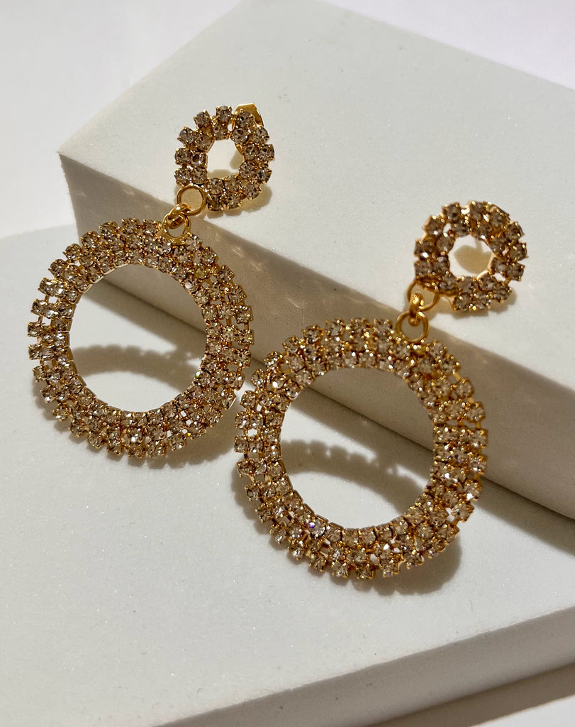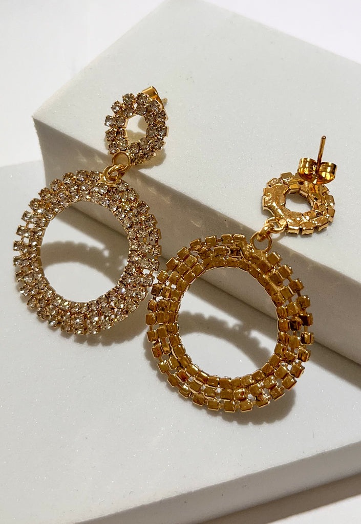 Light up the room with the Shining Girl Rhinestone Gold Earrings! A cluster of sparkly clear rhinestones sit in a gold setting while a tear-drop shaped loop (decorated in matching clear stones) hangs below. Earrings measure 1.75" tall
