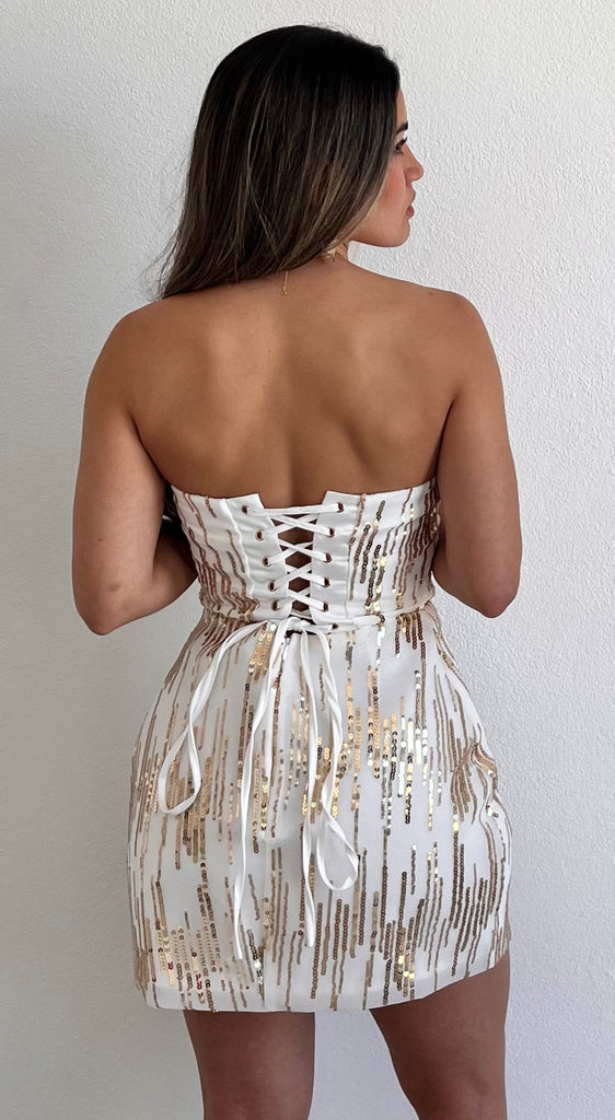featuring Strapless Corset Top, Fitted at the Waist and Flare Short Skirt in a White Mesh & Gold Sequins Fabric.