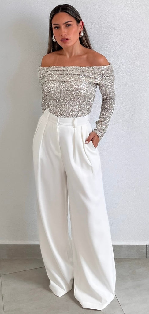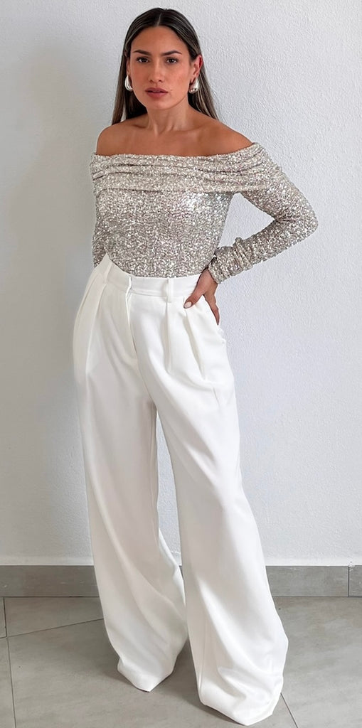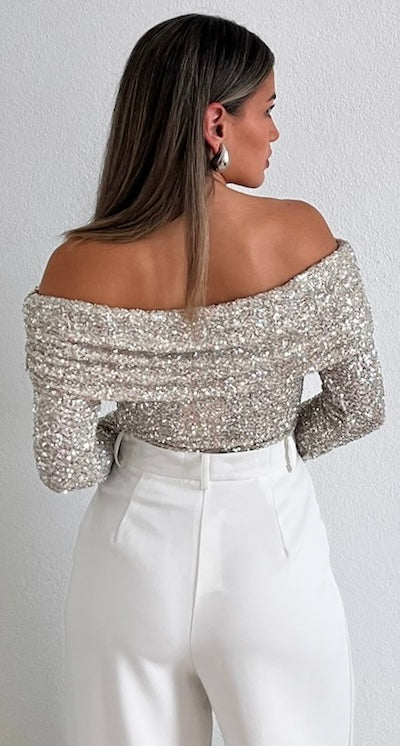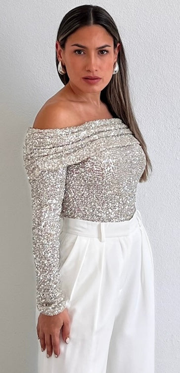 featuring Off-The-Shoulder Long Sleeves Top in Spandex Silver Sequins Fabric.