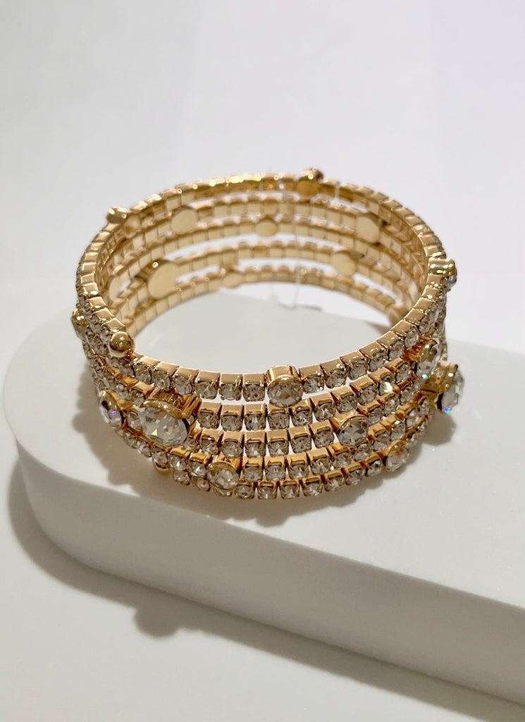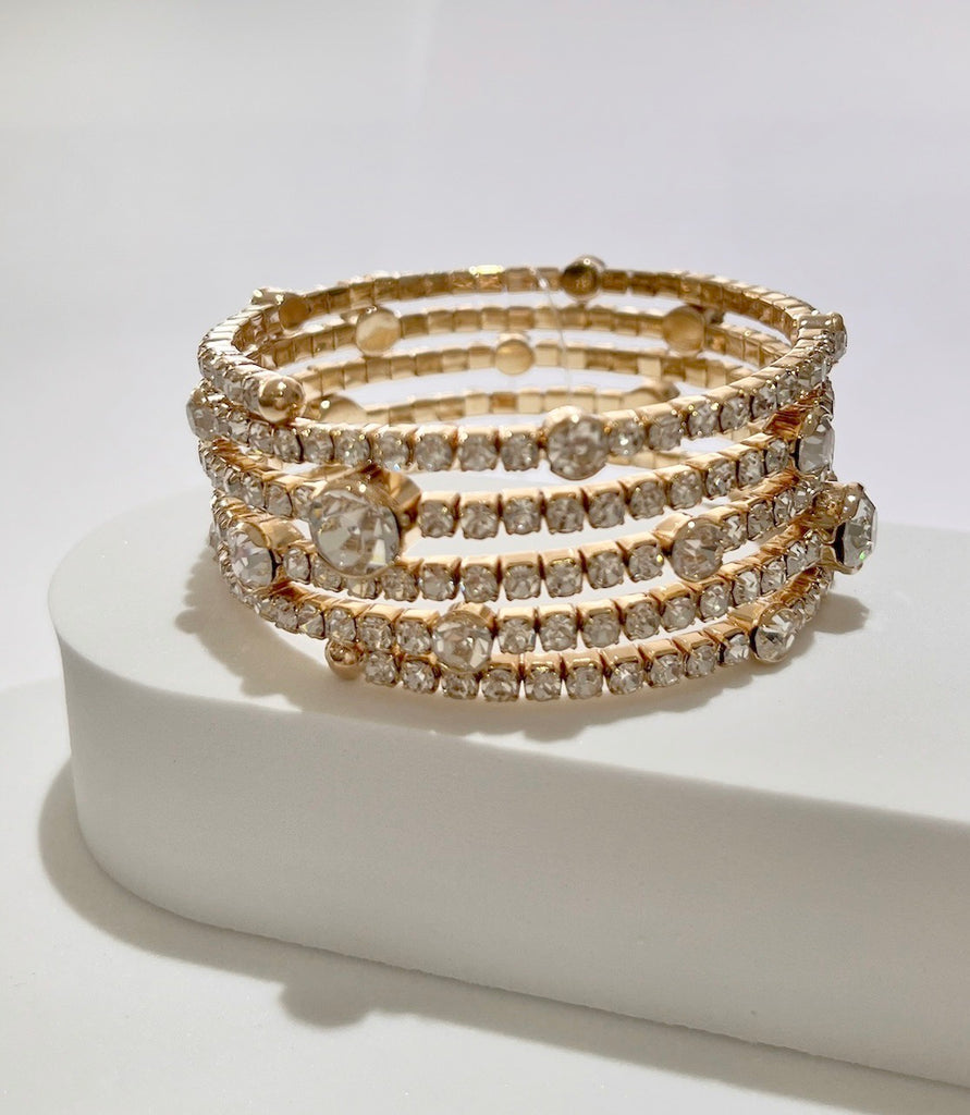 All your most important looks will shine when you add a little glamour, thanks to the Sparkling Essential Gold Rhinestone Bracelet! Shiny, gold-toned metal based this elevated, spiral-chic bracelet that has a slender silhouette with inset baguette-cut rhinestones that create this inspired design.