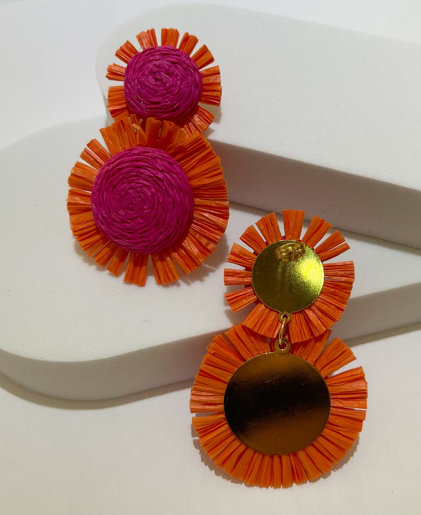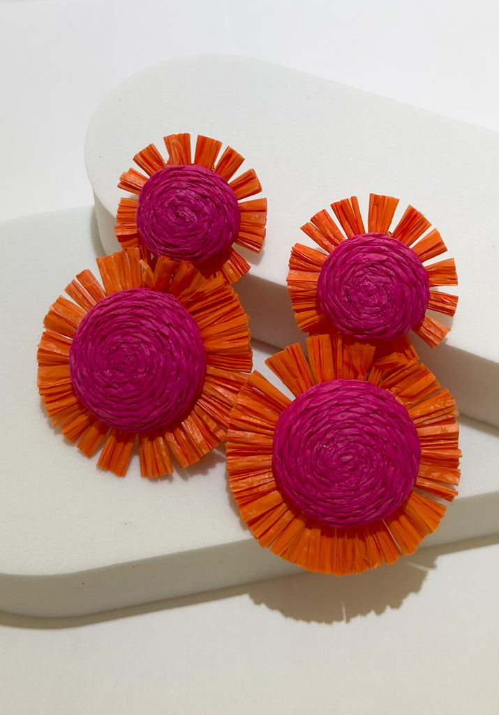 The perfect vacay 'fit is easy to achieve when you've got the Sunny Statement Pink & Orange Raffia Earrings! Summery woven raffia covers the surface of these eye-catching earrings that have oversized, circle-shaped pendants that are supported by large round posts.