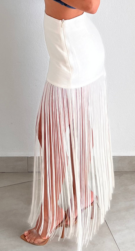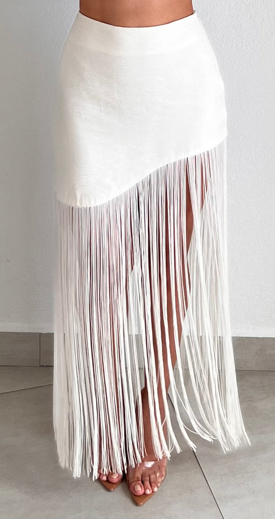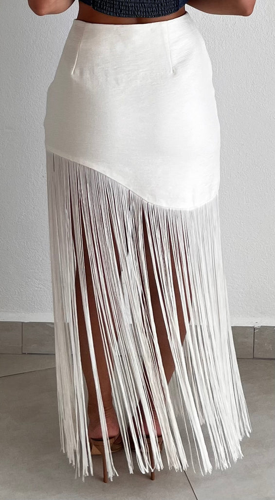 featuring High Waist and Asymmetrical Fringes Bottom Detail in a Cream Fabric.