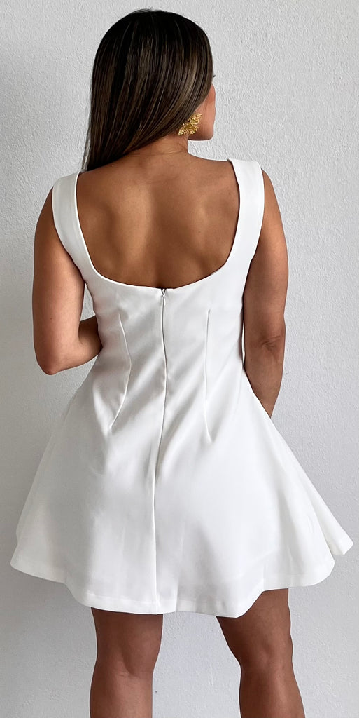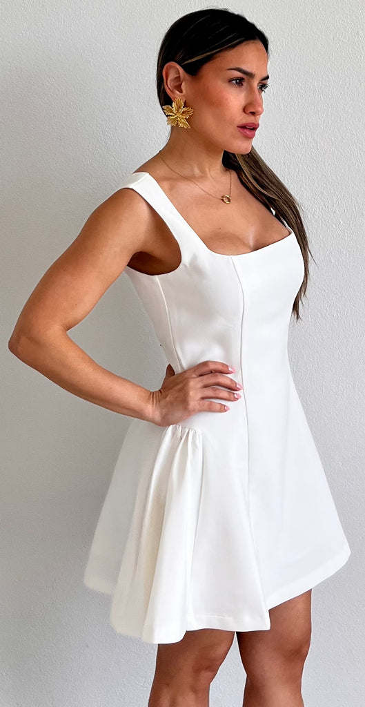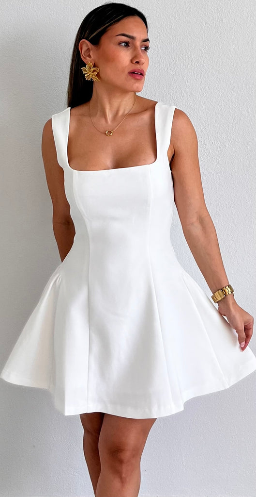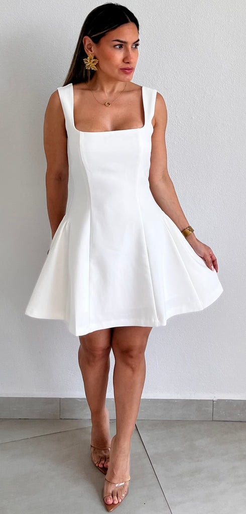 featuring Bold Square Fitted Top, Fitted at the Waist and Flare Short Skirt in a White Fabric.