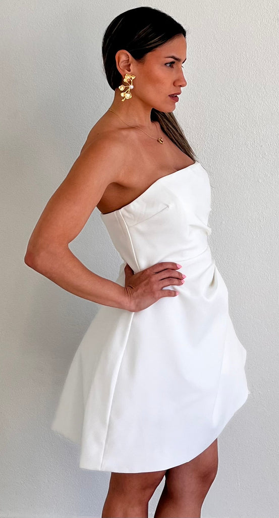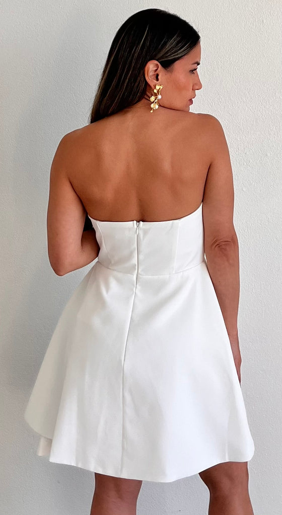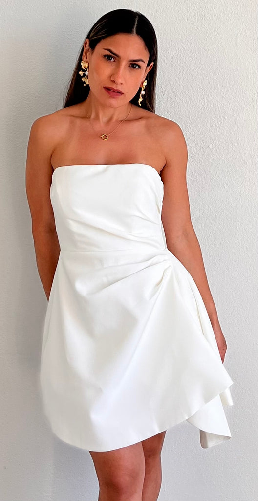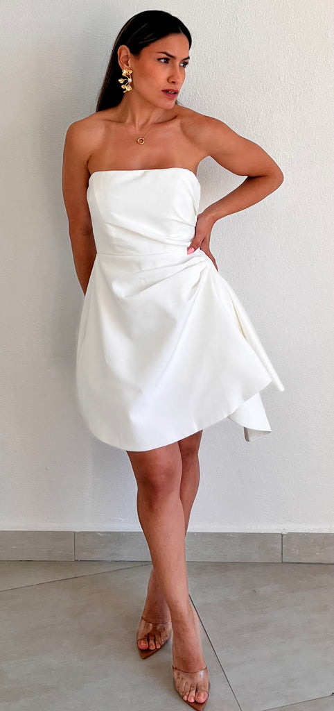 featuring Strapless Top, Draped at the Waist with Ruffled Detail at the Hips in a Soft White Fabric.