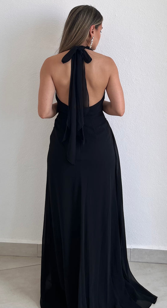 featuring Elegant and effortlessly flattering, this halter chiffon gown features a plunging neckline with softly gathered draping along the waist and hips. The floor-length skirt flows beautifully with every step, while a side slit adds a touch of modern edge. Finished with a self-tie bow at the neck and a sleek open back, this dress is perfect for weddings, proms, or sunset soirées.